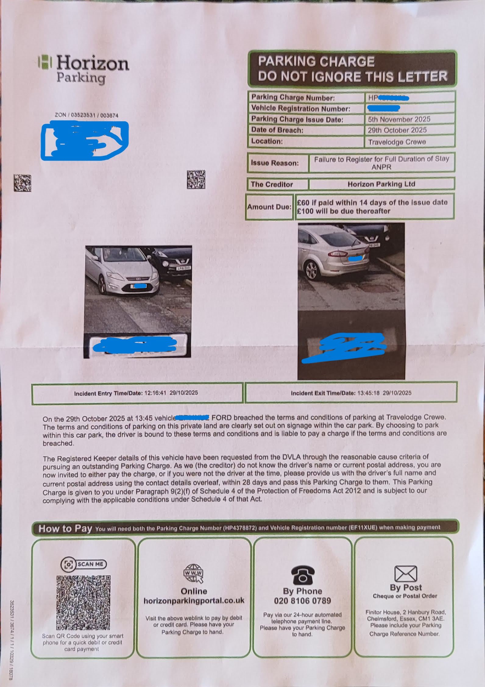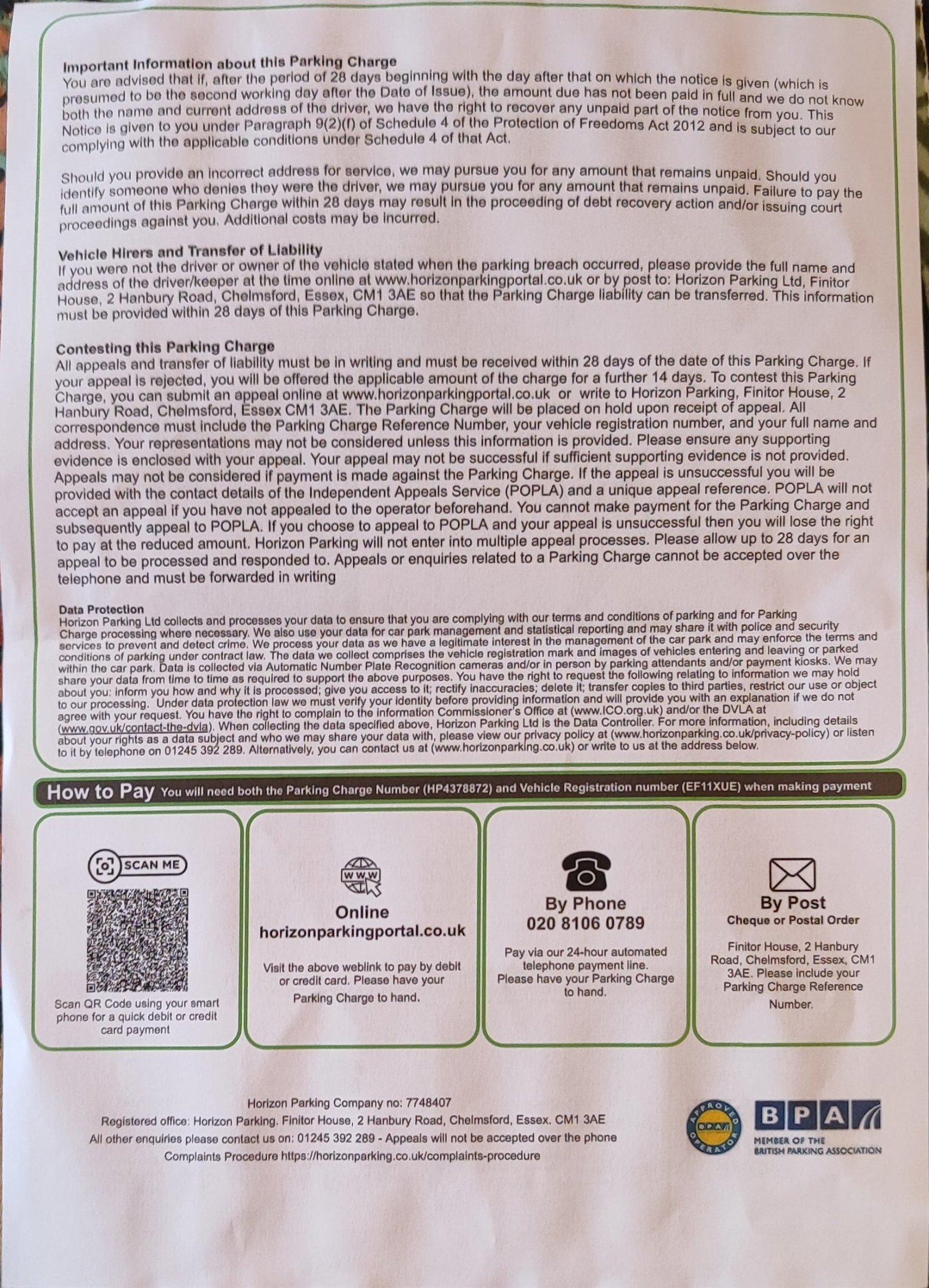 Hi, I received a parking ticket from Horizon which is unfair as I have not used the car park. I parked on the street, but the ANPR caught my plate and have issued me a fine. I have attached images of the ticket. I also show on the photos where I parked (please see the blue drawings showing where I parked).