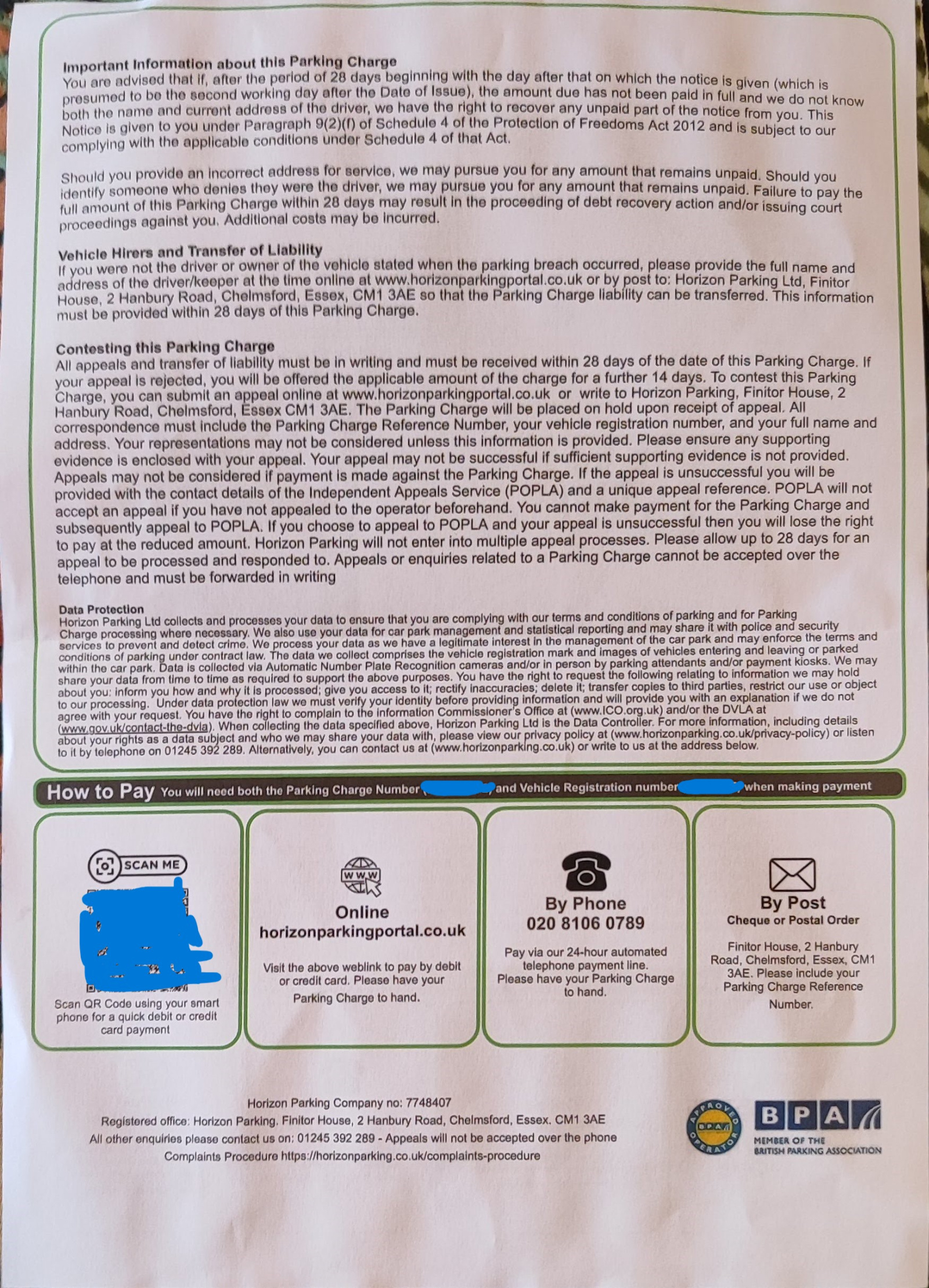 When I first started using a Premier Inn car park I phoned Horizon parking and was told I could pay after I had left using the website www.horizonspaces.co.uk When I put in the post code of my hotel WD6 1US Premier Inn Borehamwood, the only hotel options that appear for a hotel guest are Travelodge Guest. So that is what I paid as I was a hotel guest. I paid for the full duration of my stay for a Horizon carpark in good faith. The fact that their website is misleading and wrong is not my fault. I have several parking charges from them (all appealed through POPLA and awaiting a decision)