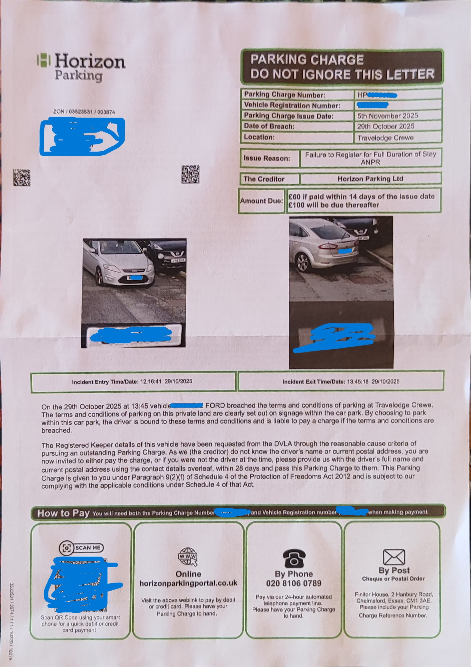 - Reason for PCN: Issued via ANPR based on car park entry/exit.