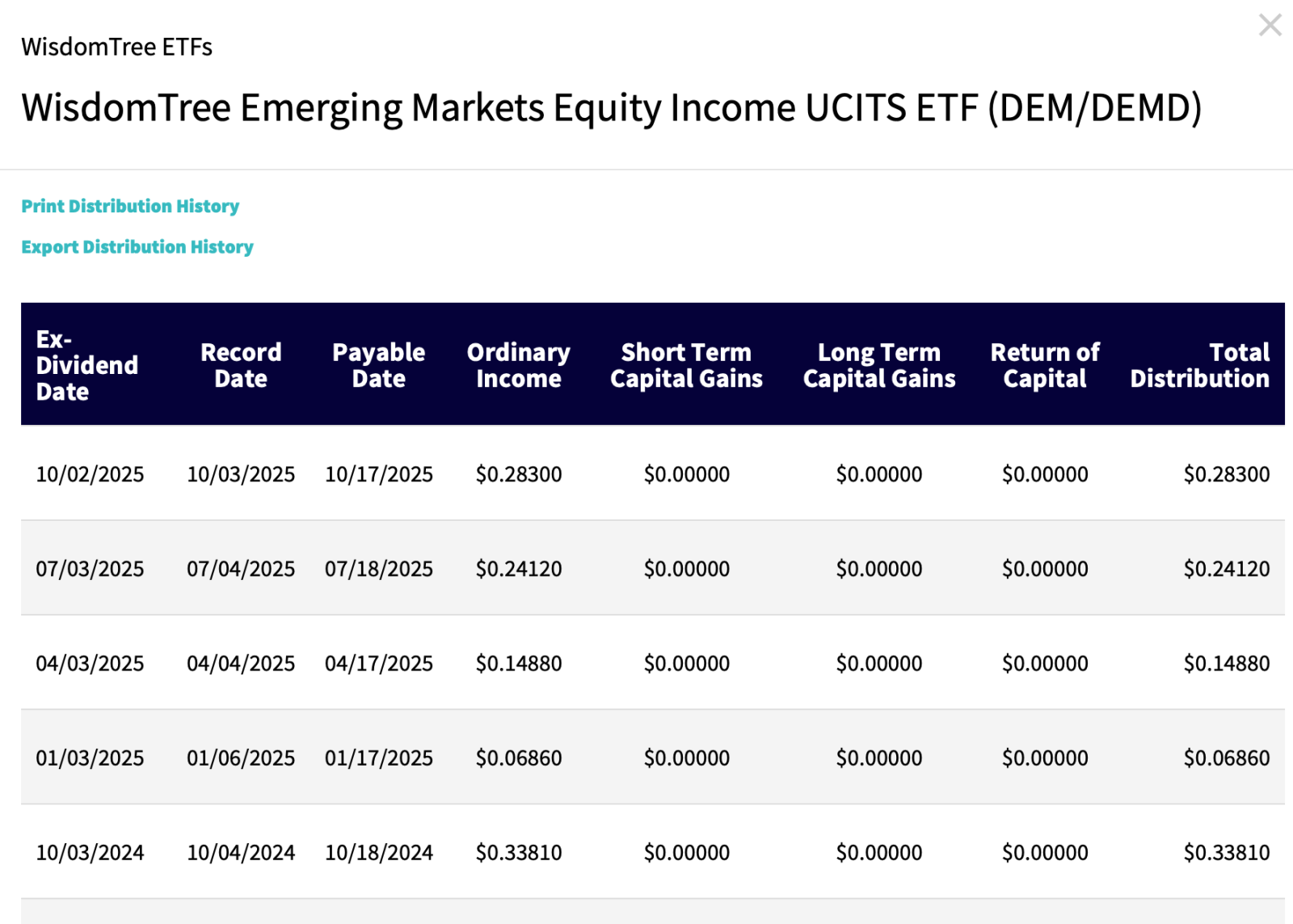 Better to go to the source than rely on third parties; WisdomTree's website indicates quarterly and USD.aroominyork said:Can someone please clarify the dividend frequency and currency of DEM, Wisdomtree EM Equity Income ETF. ISIN IE00BQQ3Q067 is priced in Sterling (I would buy it on Interactive Investor) but the dividend announcement on the LSE website shows a USD distribution. dividenddata.co.uk likewise shows USD distributions (quarterly, unlike HL which says biannual). It seems curious to have two different currencies in play for the same ETF.