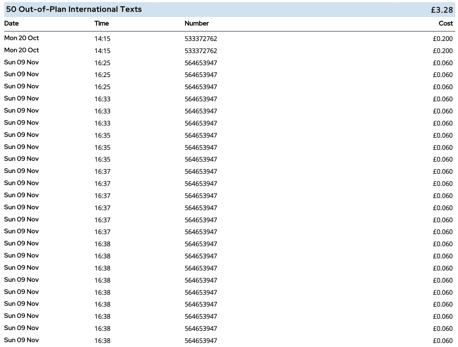 There are two messages from the same 53 prefix number from 20/10/2025 and forty-eight messages from the same 56 prefix number from 09/11/2025 (from 16:25 to 16:51, and then few more at 17:35). I genuinely have no idea what any of these are (and I can't see anything in my phone's SMS history). I don't send a lot of texts as it is, and never internationally.
