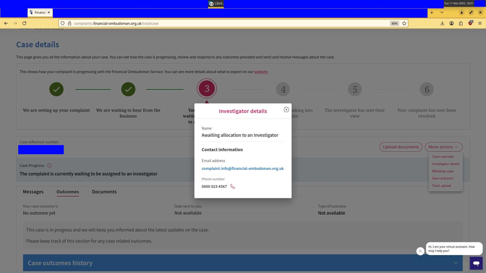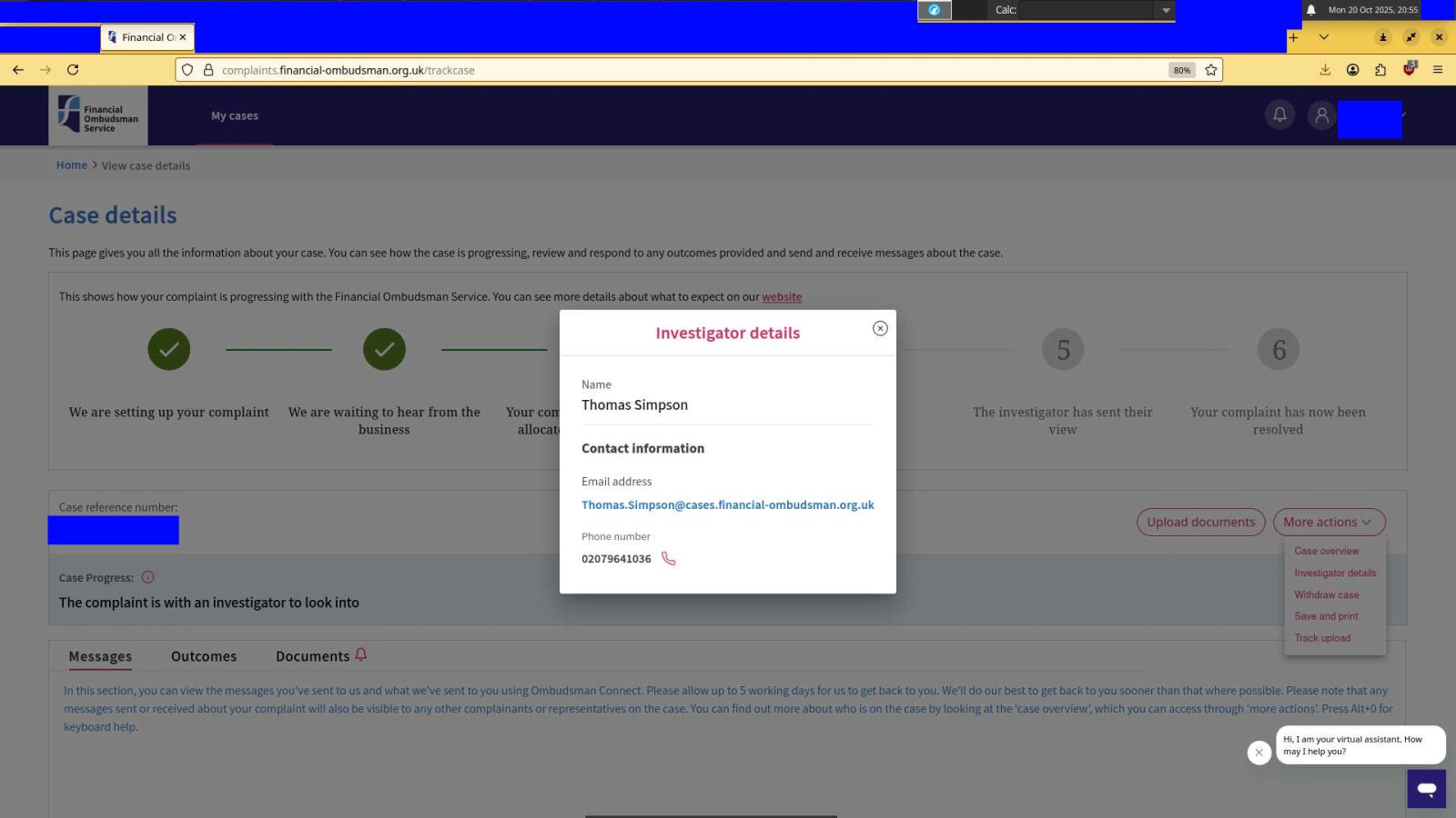 I checked the Ombudsman Connect platform on the 20 October 2025 and it said case had been allocated to an investigator (has investigator details including contact information):