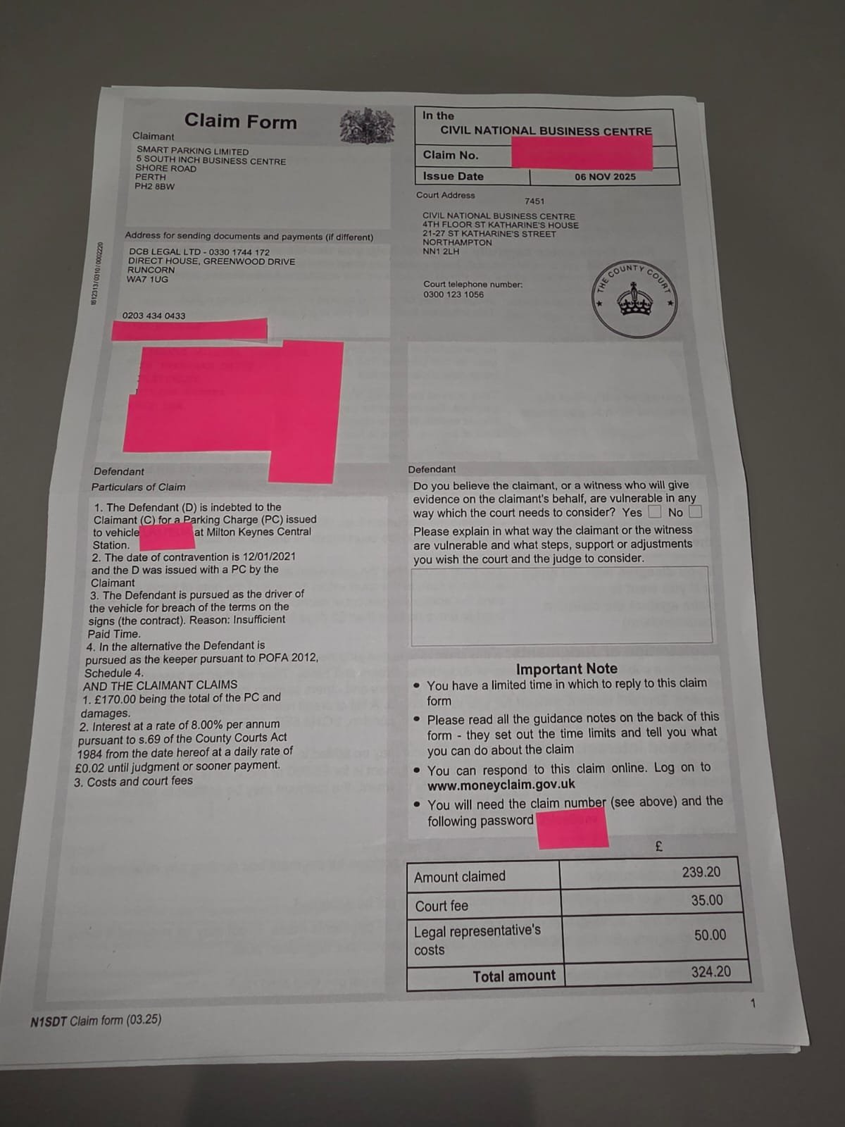a County Court Claim Form I've recently received from HMCTS regarding a parking