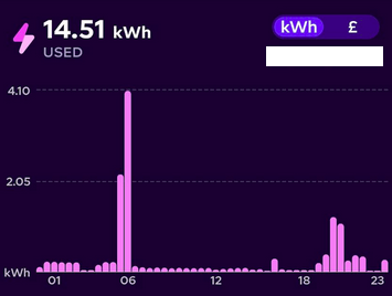 Most of my usage falls within 05:30-06:30 and 19:00-22:30. Prices in those slots compared...05:30 16.69 vs 17.68 (Agile +1p) [today 3.1 kWh used]06:00 29.91 vs 18.48 (Agile -11p) [today 3.2 kWh used]19:00-22:30 29.91 vs 17.00 to 21.34 (Agile -8 to -12p)The 0.3 kWh used for food prep will probably happen at 5pm and there I will pay an extra 5p ish. But on the flip side, I won't be running my dehumidifier during the day (wouldn't on either tariff), so an even greater proportion of my usage will be in those early/late slots.So that blended amber rate is a killer for me when daytime prices do this.That's normal for me. Electric shower and a blast of heating when I get up, then very little until I get home from work. Usually run a desiccant dehumidifier overnight when prices are favourable, which is what you can see in the early hours, which contributes some "waste" heat.The only load shifting I do is out of the 4-7pm slots, otherwise my evening usage would be shifted 2-3 hours earlier.1