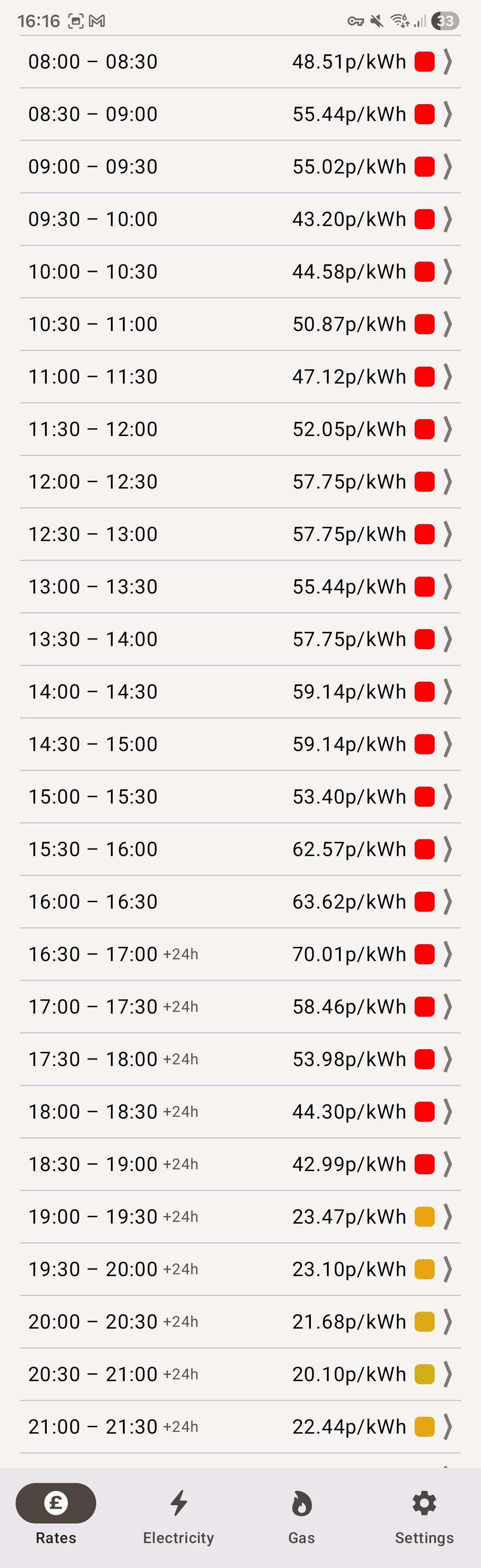 Most of my usage falls within 05:30-06:30 and 19:00-22:30. Prices in those slots compared...05:30 16.69 vs 17.68 (Agile +1p) [today 3.1 kWh used]06:00 29.91 vs 18.48 (Agile -11p) [today 3.2 kWh used]19:00-22:30 29.91 vs 17.00 to 21.34 (Agile -8 to -12p)The 0.3 kWh used for food prep will probably happen at 5pm and there I will pay an extra 5p ish. But on the flip side, I won't be running my dehumidifier during the day (wouldn't on either tariff), so an even greater proportion of my usage will be in those early/late slots.So that blended amber rate is a killer for me when daytime prices do this.
