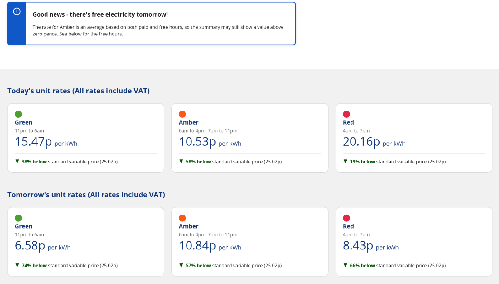 Looks as though there could be free electric tomorrow between 14:00 and 16:00. Even the red period will be around 15p per kWh.