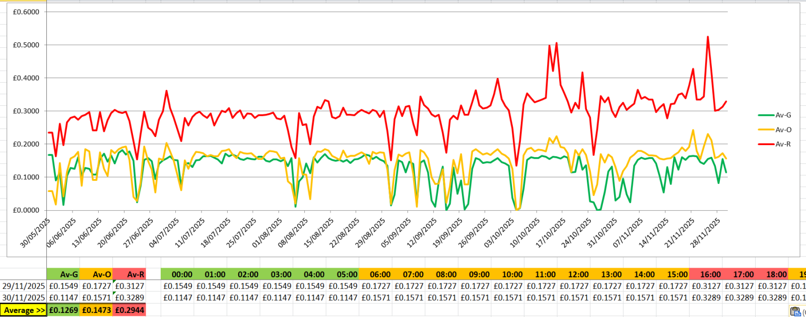Geoffers0_0 said:I've been compiling a spreadsheet analysis of this EDF FreePhase dynamic tariff for the past 6 months, since the daily figures started from May 30 2025.Each day's values for the green/orange/red periods have been averaged then plotted on a graph. The average value over 6 months for each time period worked out as Green = 12.7p / Orange = 14.7p / Red = 29.4p