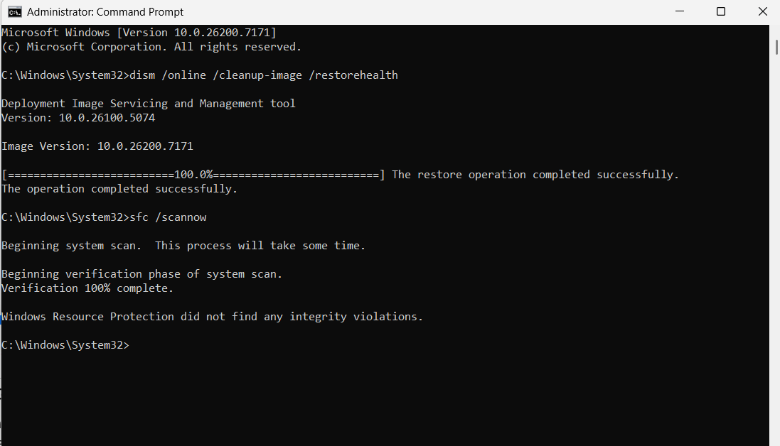 Here is a screenshot of what running DISM followed by SFC looks like in an elevated command window: