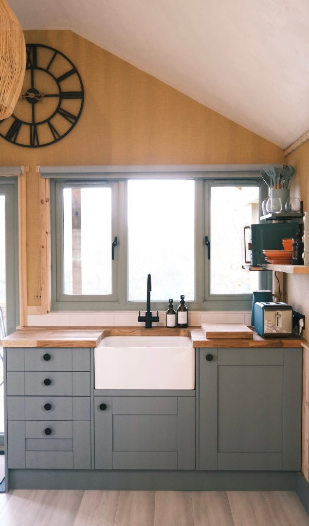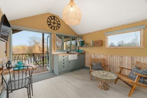 - Kitchenette essentials: 2-burner hob, microwave, fridge/freezer, kettle, toaster