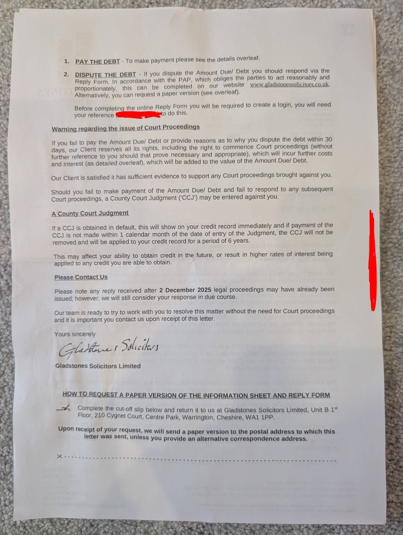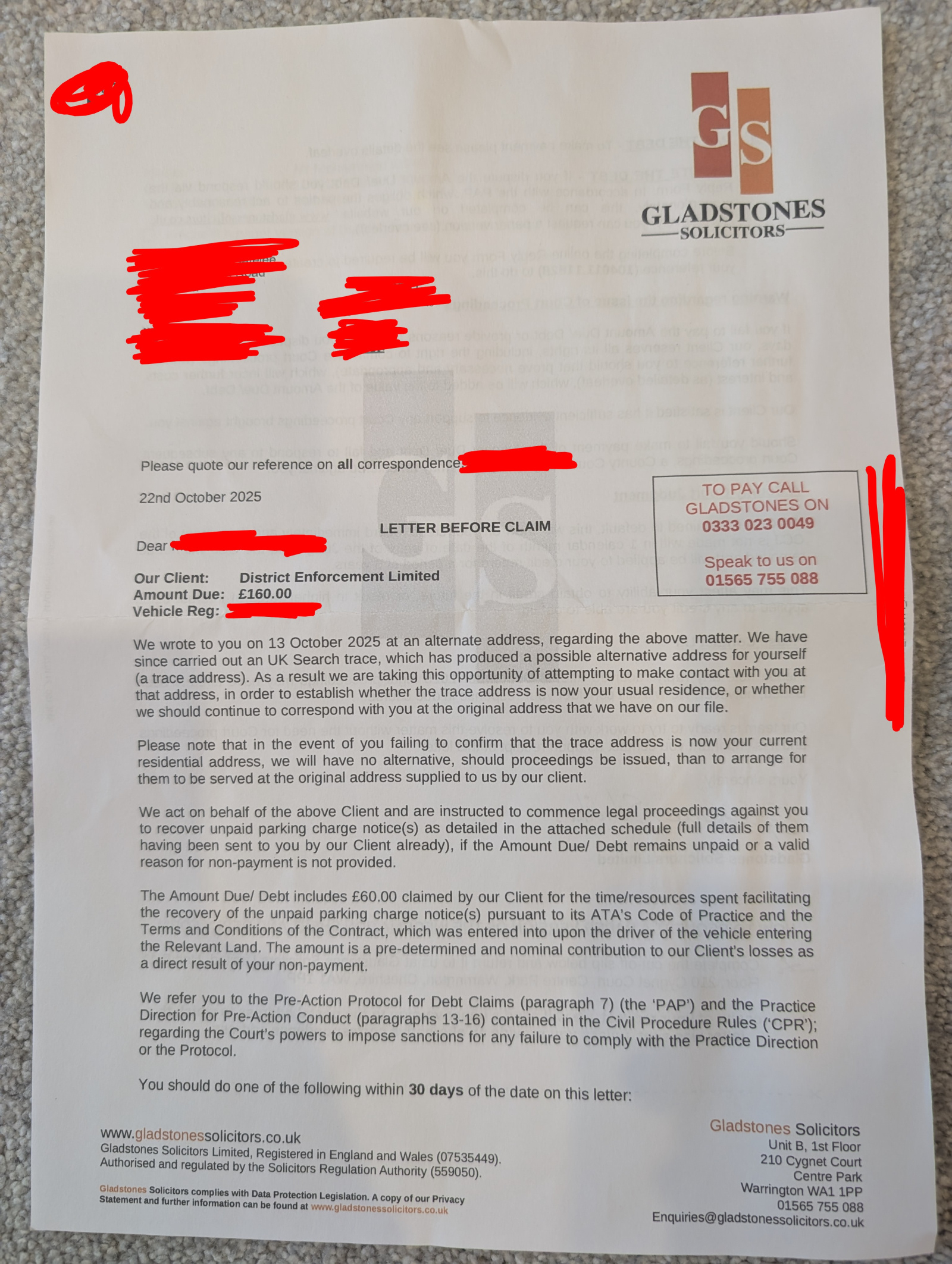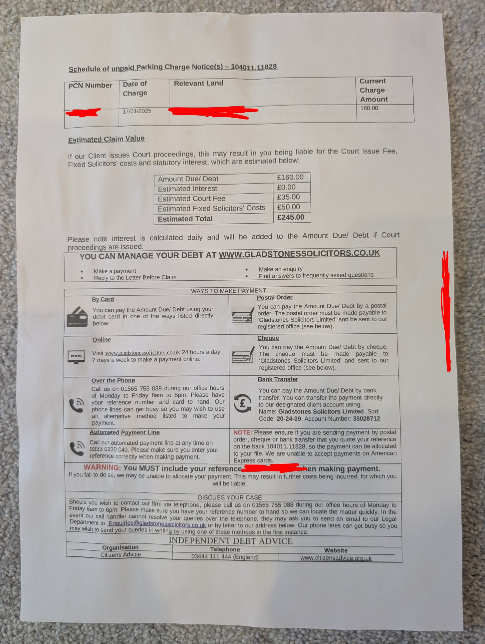 I’m looking for some advice as I’ve just received a Letter Before Claim from Gladstones Solicitors chasing me for an unpaid PCN from January 2025 (nearly 11 months ago). This has appeared completely out of nowhere.