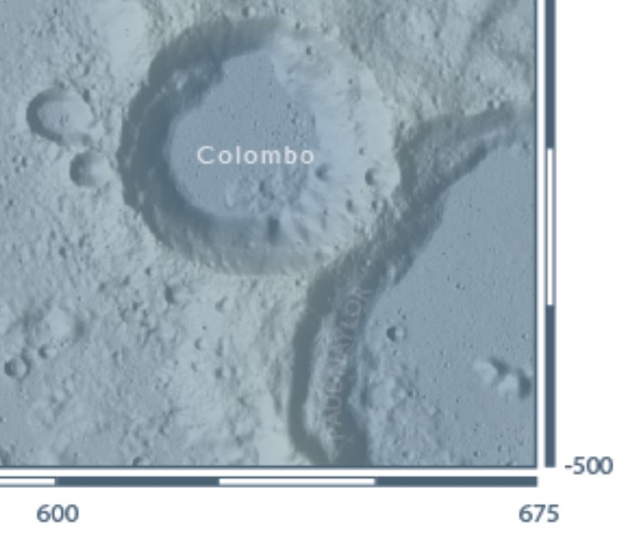 So I'd say the answer is Colombo (well technically it's on the edge of a crater that's closer but it's not named on the map so I doubt they want you to go digging up the name of the unlabelled one).21 -