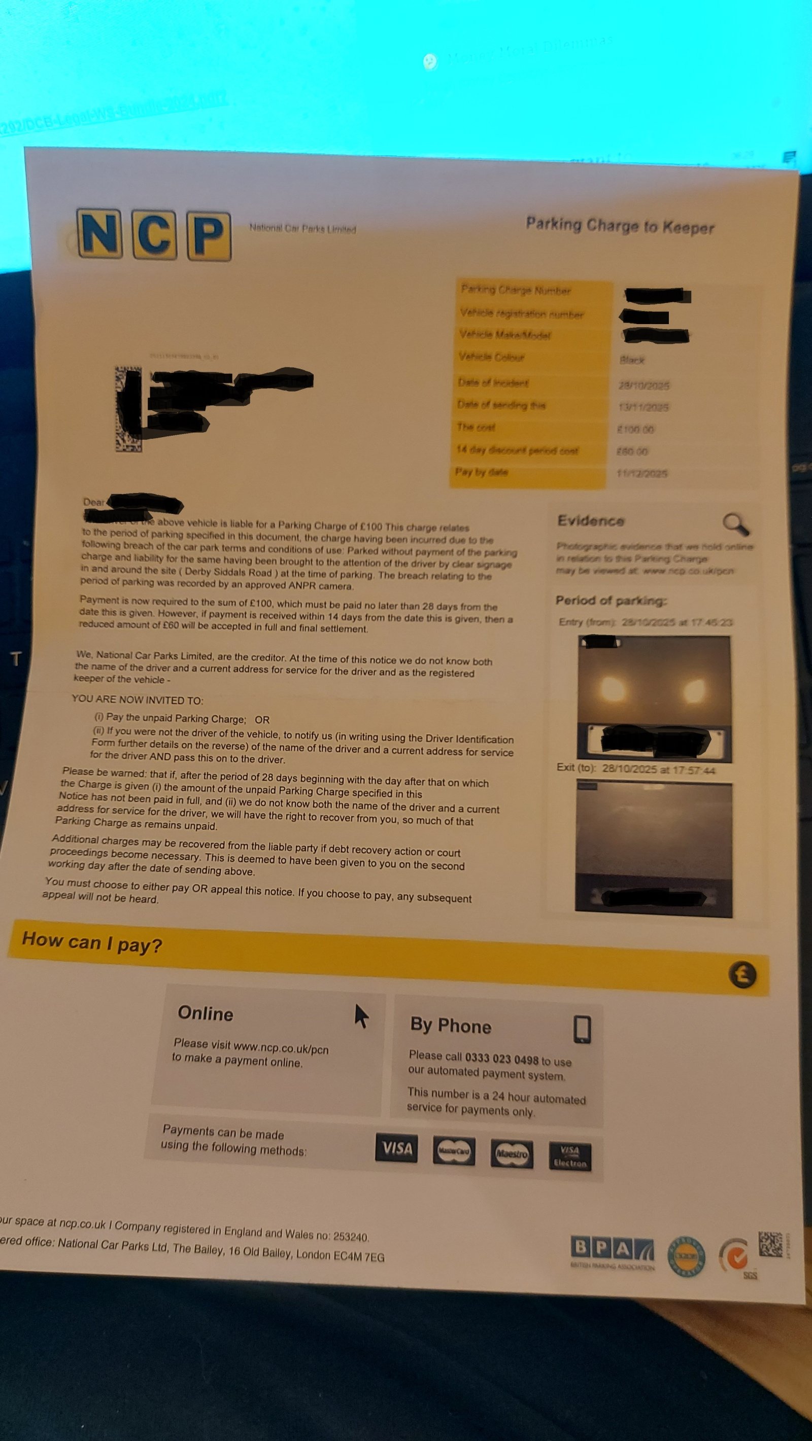 Hi folks, I've just received a Parking Charge to Keeper letter from the NCP.