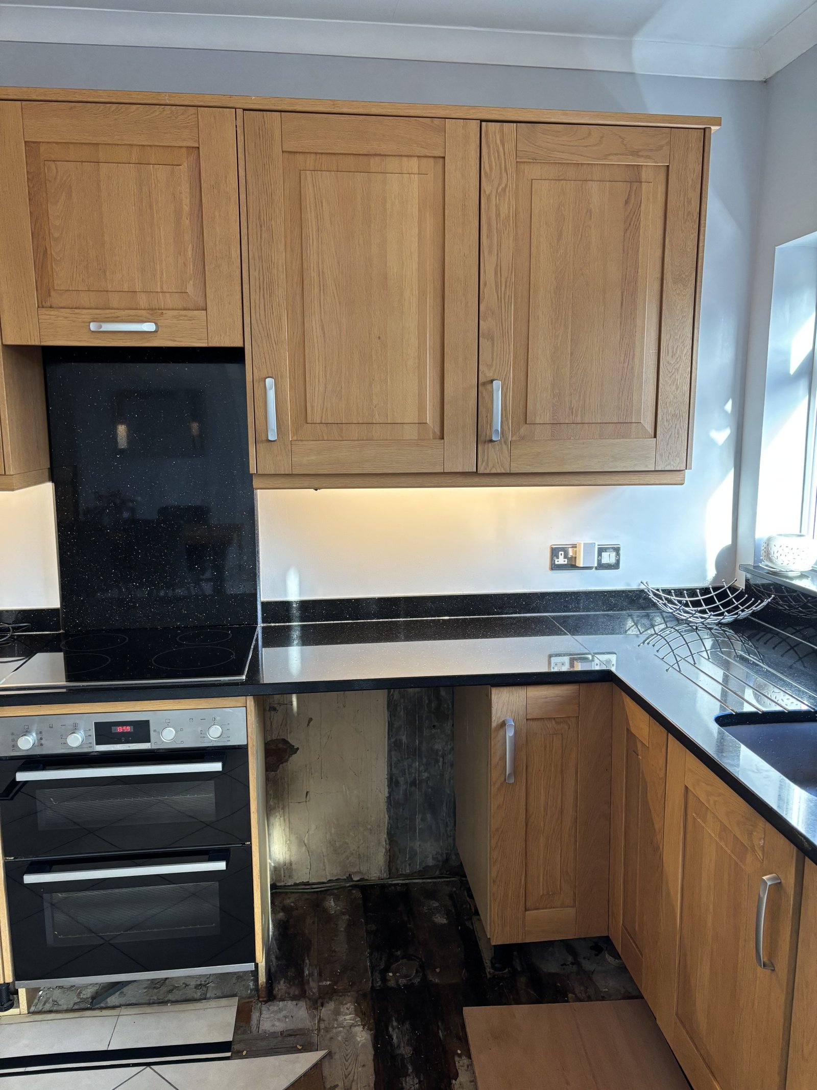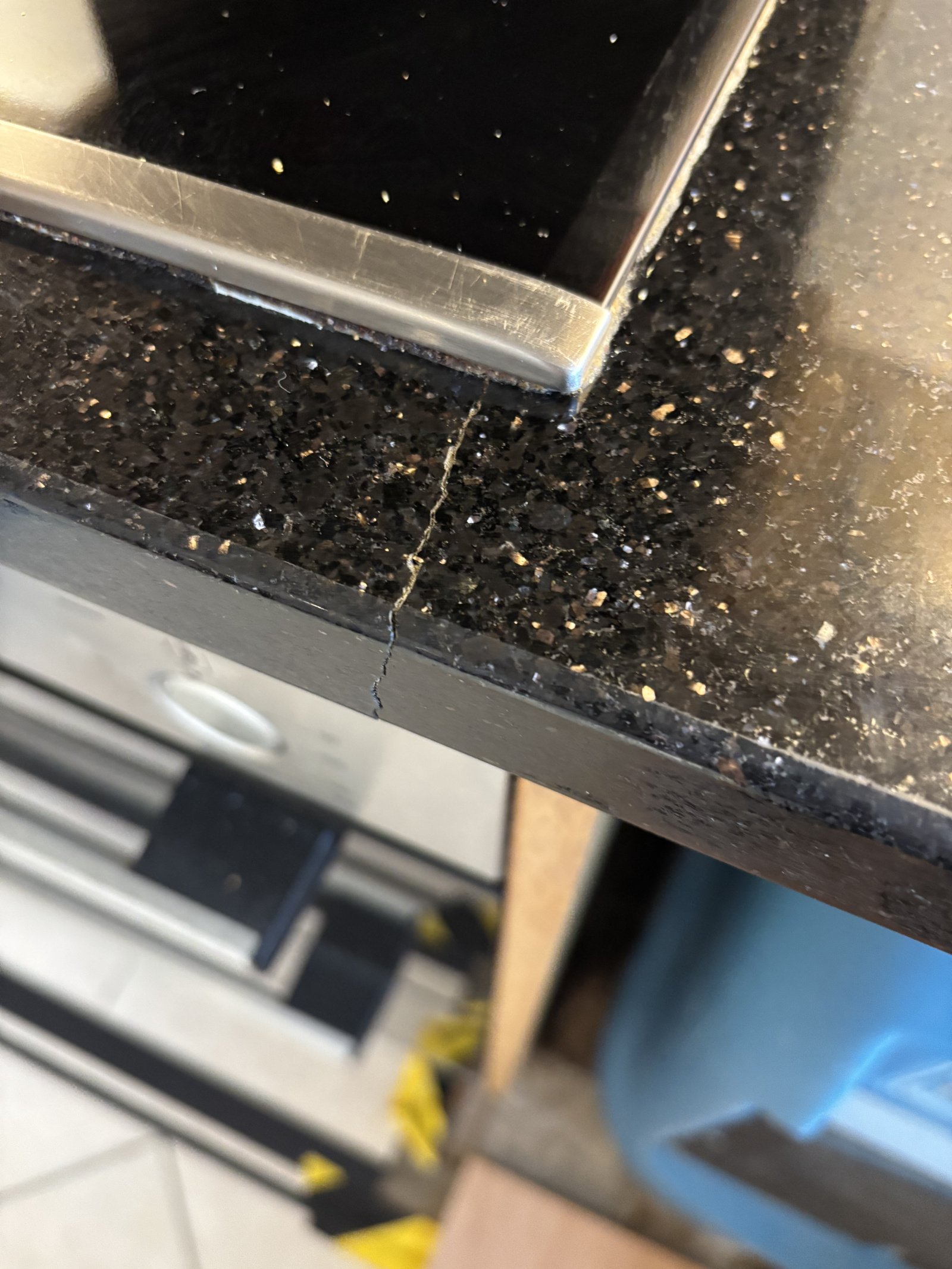 We have a crack in our granite which he feels was caused by movement due to the wet. Also to replace side panel and get the carcas out of the corner he could not guarantee that the granite would completely crack and as the kitchen is 20 years old a new carcas would be a different size and not fit our door.