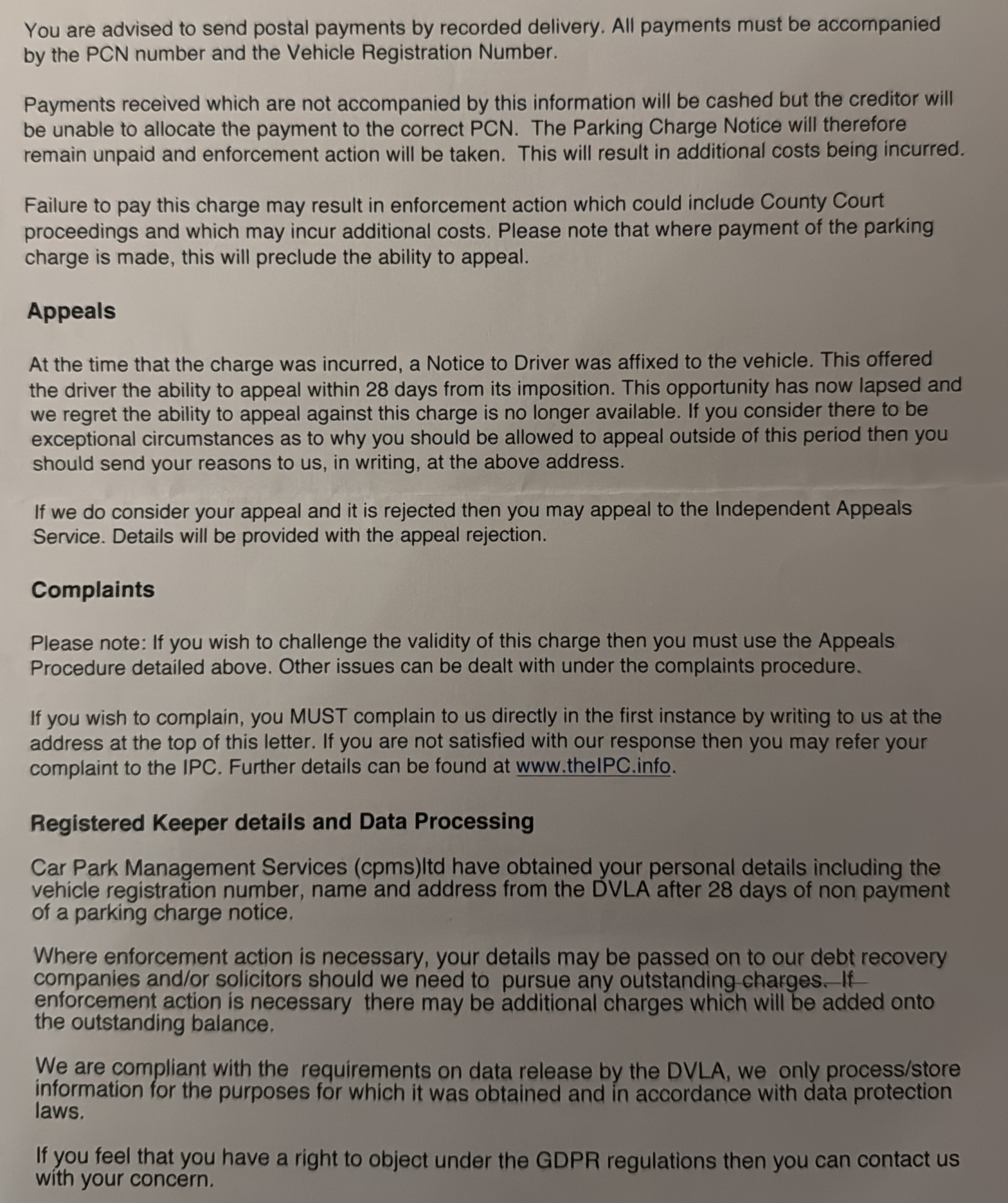 Seen that lie before but I am collecting evidence of rogue conduct. I think it's ZZPS doing the back office work for CPMS in this case.PRIVATE 'PCN'? DON'T PAY BUT DON'T IGNORE IT (except N.Ireland).