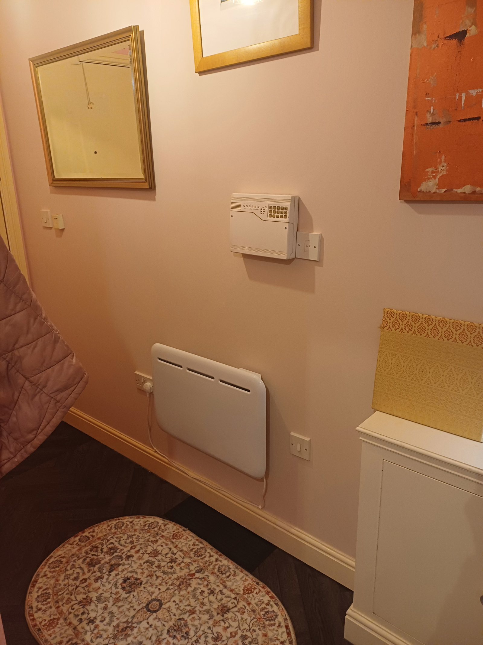 New heater in situ. I fixed the bit of flooring underneath and painted the wall. It's 1.5kw and I only put it on when I'm having guests.