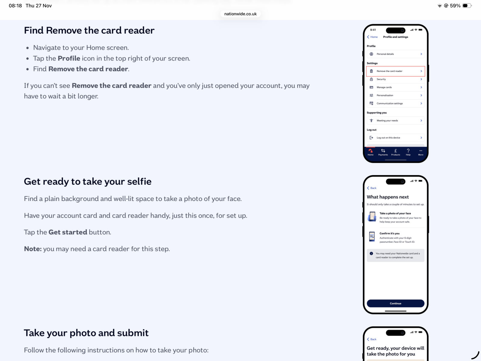 Nationwide were bombarding me nearly two years ago with notices that you could replace the card reader with biometrics if you did a short one off verification process. Did it in 2 minutes and never used the card reader since.