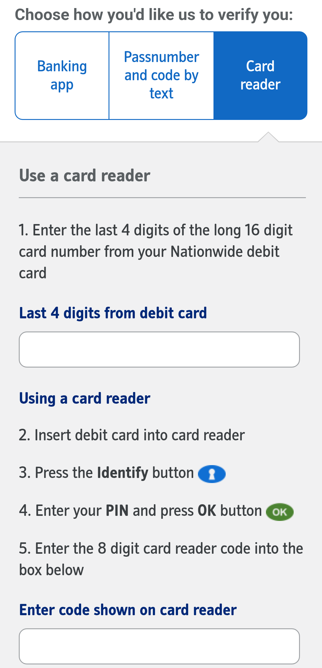 I have one debit card and one credit card and I only use the debit card in the card reader. On my second and third attempts at using the card reader and the correct last four digits, the card reader timed out both times.I have a Nationwide credit card, but the online banking login screen I get is very specific in asking for "Last 4 digits from debit card".I get that every time I log in, and I'm doing everything 'correctly'.2 -