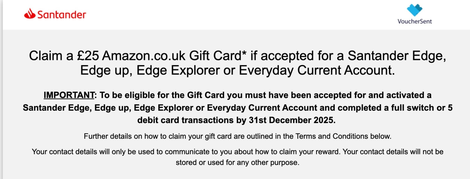 2. The offer is listed by Be Clever with Your Cash, ClearScore Technology Limited, Comparethemarket, Credit Karma UK Limited, Creditec, Dot Zinc Limited, Experian Ltd, Finder.com, Fair Investment, GoCompare, Loqbox Technology, Moneysupermarket, Money Saving Expert, News UK, Quidco.com, Totum, Topcashback Group, TotallyMoney, Usnoop or Uswitch Limited and fulfilled by VoucherSent, a brand of Optimise Media (UK) Ltd. Santander UK plc has no liability in relation to the provision of this offer. The offer is only open to UK residents who are aged 18 years and above who successfully apply for a Santander Edge, Edge up, Edge Explorer or Everyday Current Account via this link, not over the phone, webchat, or by direct online purchases, from Thursday 27th November 2025. This offer may be withdrawn at any time. Only one Gift Card will be delivered per person. If you take out more than one Santander current account during the duration of this offer (Santander Edge, Edge Up, Edge Explorer and Everyday Current Account), only one account will be deemed eligible to receive a voucher. You and any joint account holder(s) won't be entitled to more than one Amazon.co.uk Gift Card between you. If you are transferring an existing Santander account you will not be eligible.