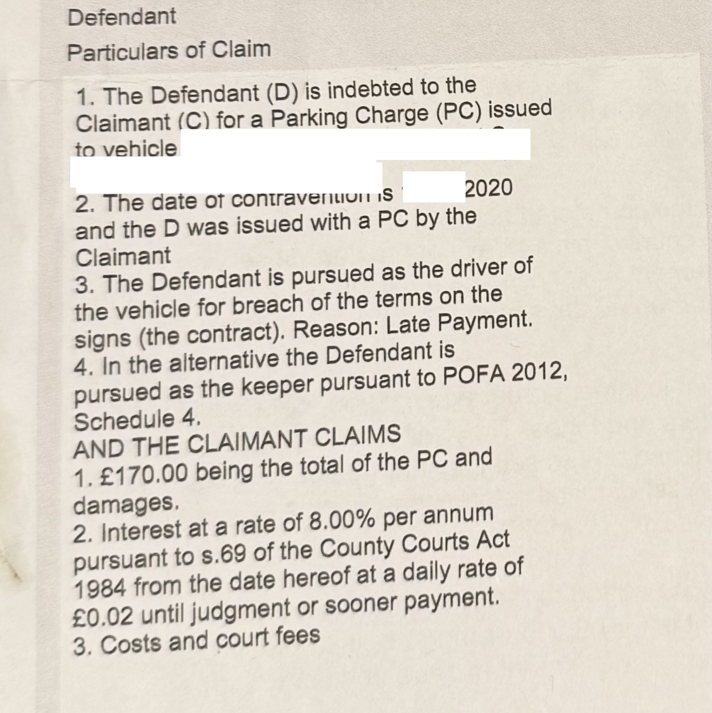 Regarding the Particulars of Claim paragraph 4, research has proved that this Claimant has never used the POFA 2012 and has never been able to hold registered keepers liable. The solicitor signatory of the statement of truth on this claim is knowingly or negligently misleading the court by citing that law. Because of the age of the claim and the lack of evidence produced by the Claimant the pleaded breach of ‘late payment’ is refuted.Accordingly, the Claimant is put to strict proof of: