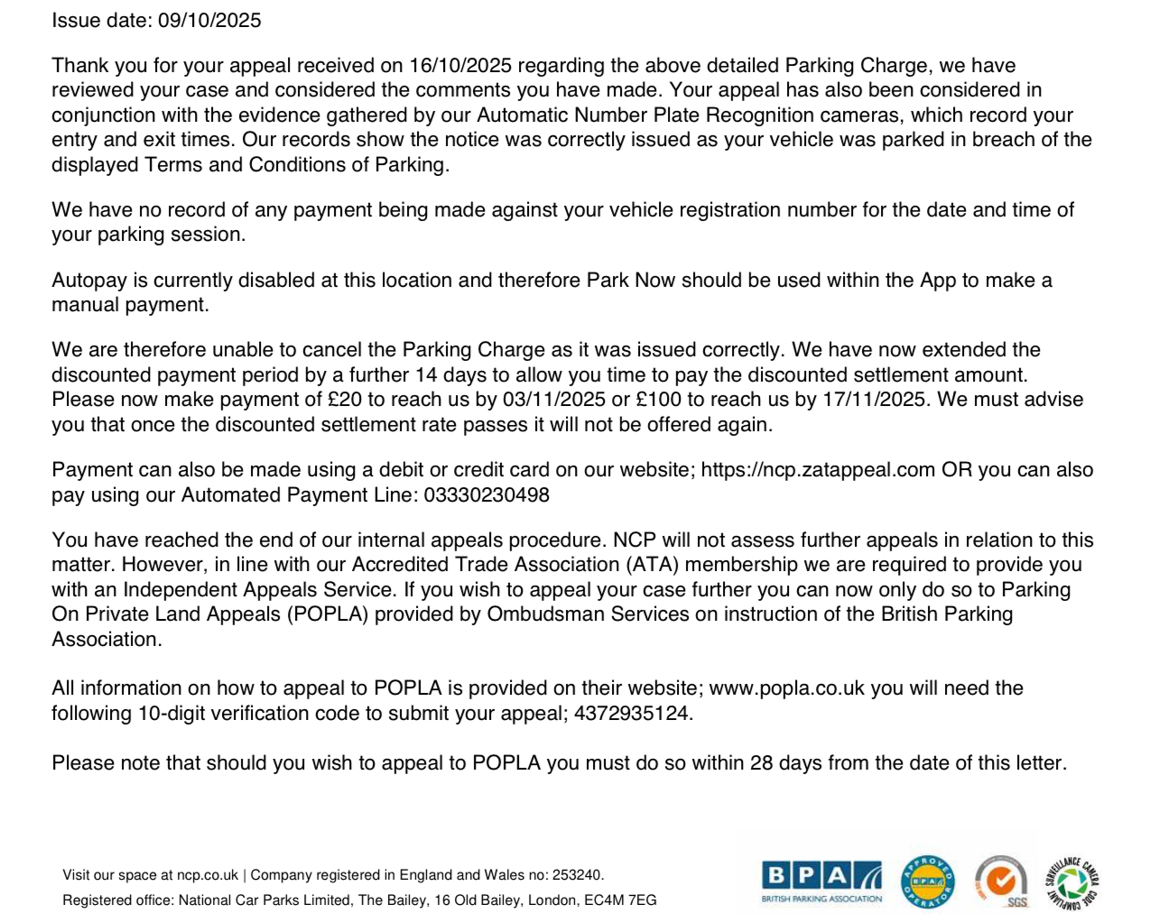 I disputed this based on the fact that I had used Autopay at the end of October 2023 and payment was taken/accepted. I had used it once since, but that was in an underground NCP parking lot, so that was paid at the barrier, as I was unable to load the App.