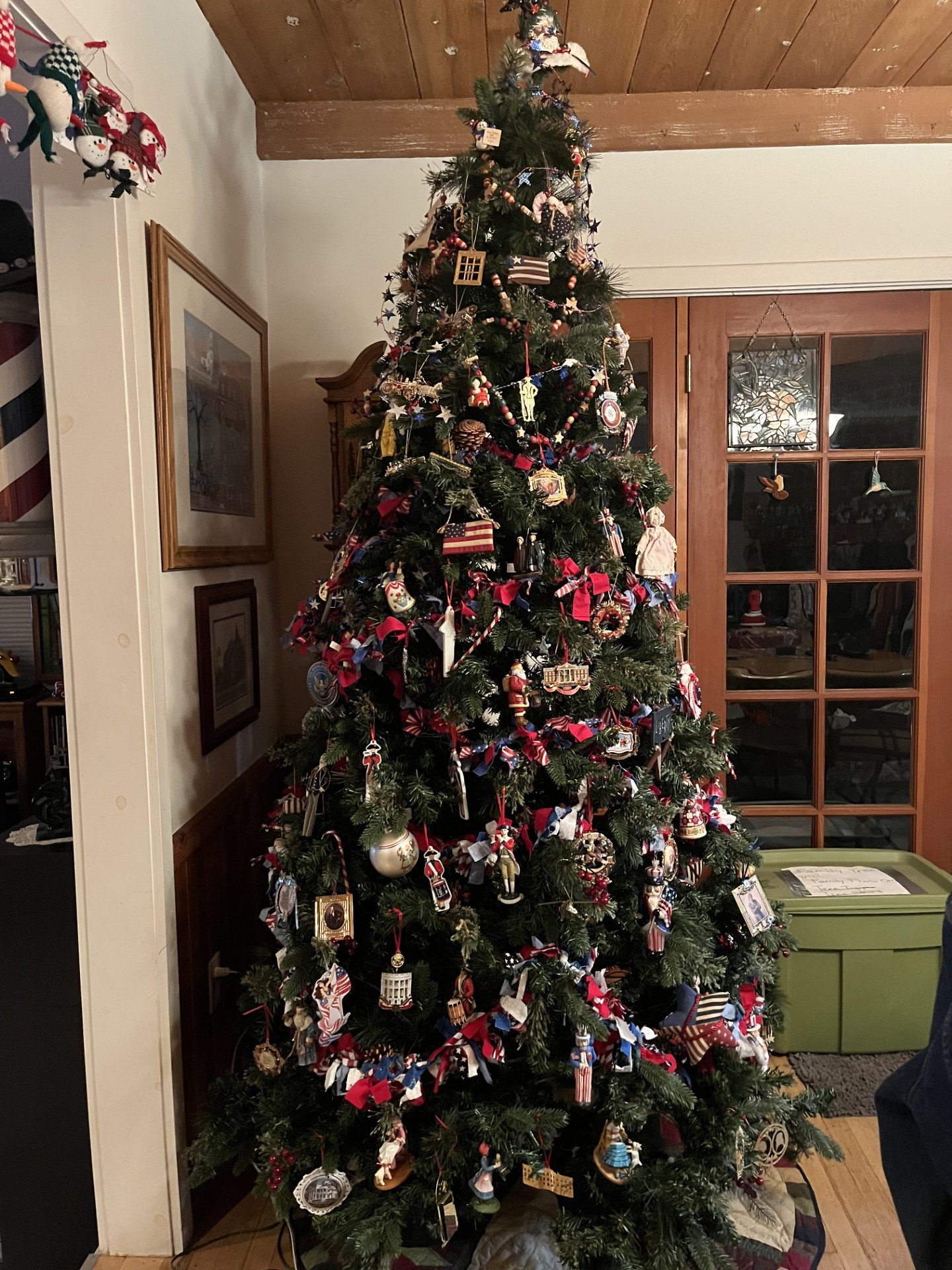 Went to two Christmas concerts on Saturday. Then to my sister's to help with the Family Tree - because it has pictures of the family over the last 50 years on it. That was tree number 15 and she has decided that is enough for this year. This is the patriotic tree: