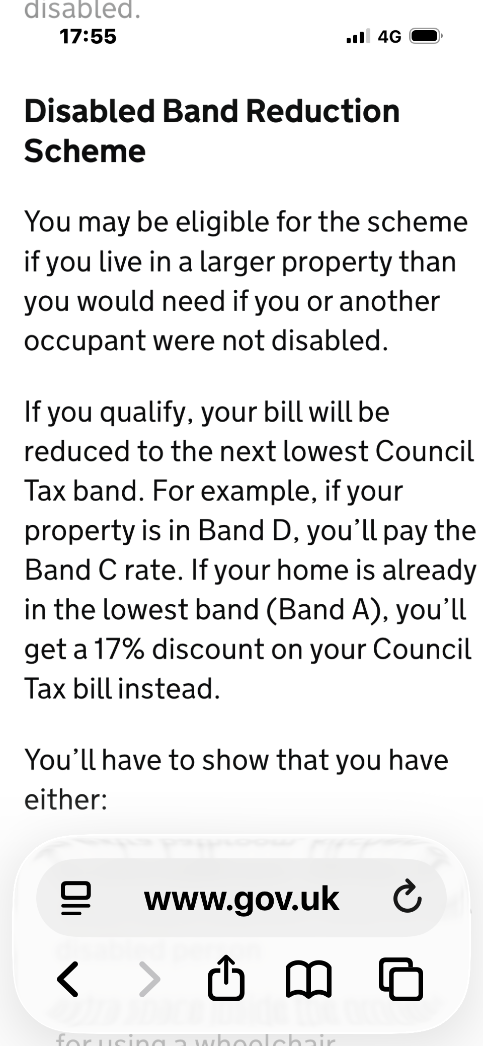basically it me my disabled wife and older daughter who is also disabled so we could live in a 2 bedroom house but due to my wife’s disability she has 2 brain tumours Epilepsy bad arthritis and fibromyalgia she is in constant pain and discomfort and her sleeping is not good she also eats her meals in her bedroom and 99% of time she spends in her bedroom im her carer and cannot share not sleep in her bedroom as I would not be able to sleep and get any rest so we had to get a 3 bedroom house Universal Credit recognised why we need a 3 bedroom instead of of 2 but council tax has denied it even though I have said we could live in a 2 bedroom if it wasn’t for her disability and we then would pay less rent an probably less council tax I font feel this is right.