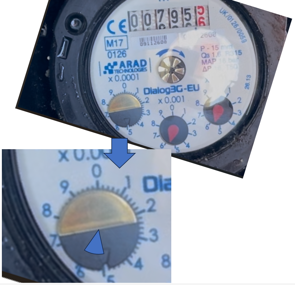 If the 0.0001 dial increases by one unit more (100ml) before and after, it indicates that there could be roughly 5% more water being recorded than being used. At this point you may choose to contact your water supplier to ask them to validate.