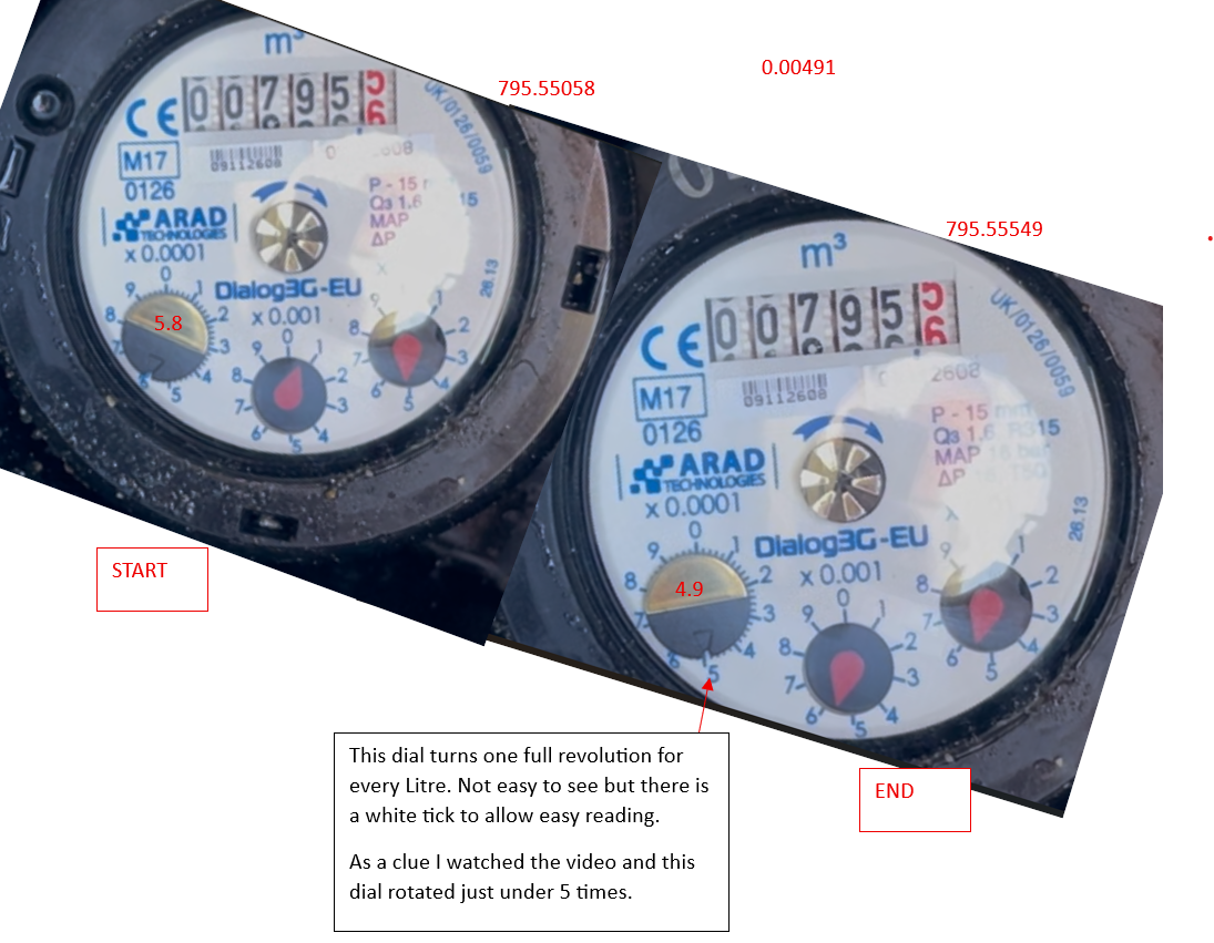 Hi Matt - To try and explain how to read the meter I went out in the rain and did a video of the water meter while my wife ran a tap. The video lasted for 50 seconds so you can see before and after. My meter is what Southern water fitted a few years ago.MattMattMattUK said:The idea that you can accurately measure against your meter bases on 2 litres is farcical, you would struggle to be accurately measure within even 5% on 100 litres and that would require you careful running the meter up to the tick point before trying, the logging again at 100 litres.