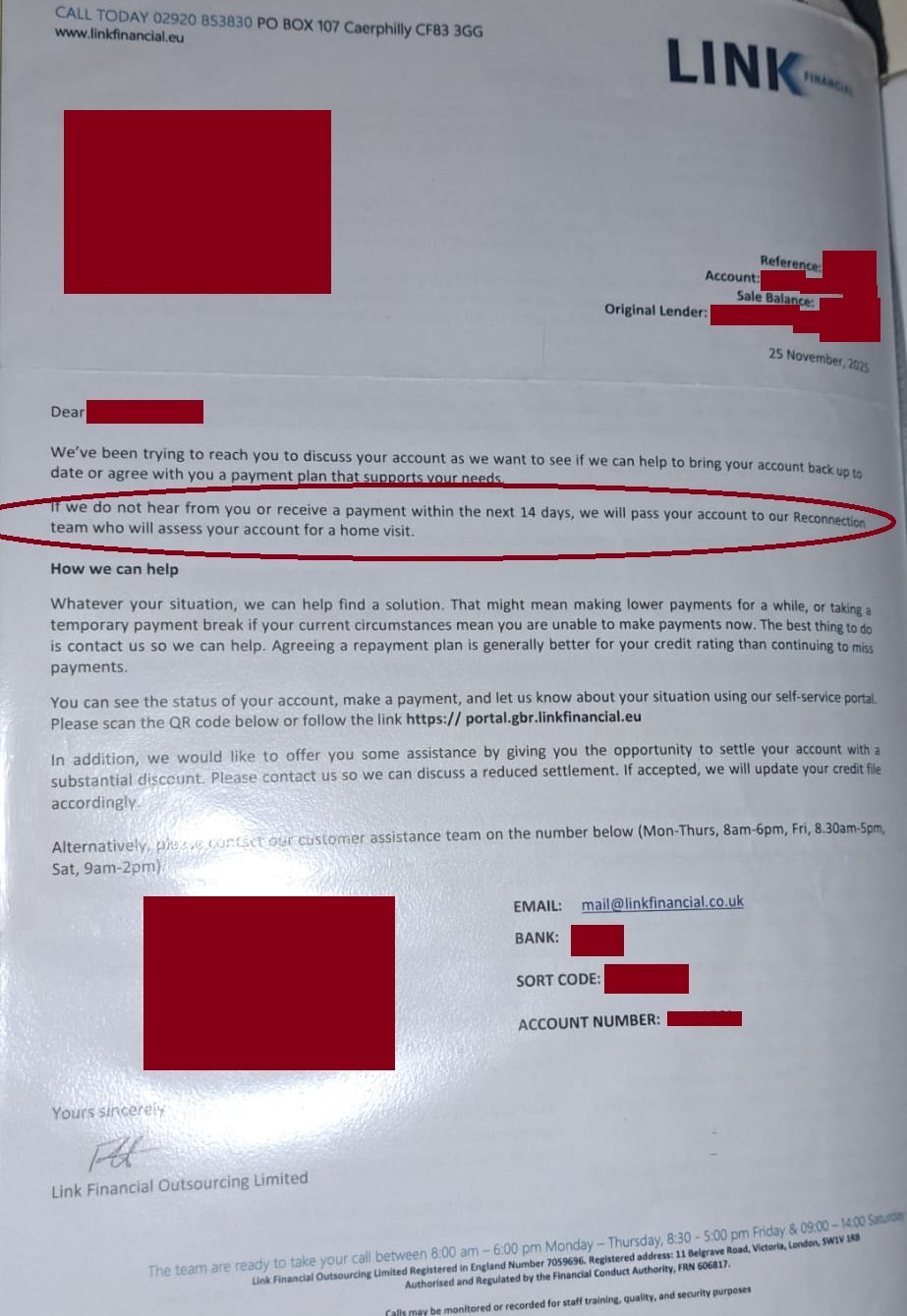 I received the attached letter from LINK on 25th November 2025 stating they are potentially going to pass the account to their "Reconnections Team" who will asses the account for a "HOME VISIT" to my house.