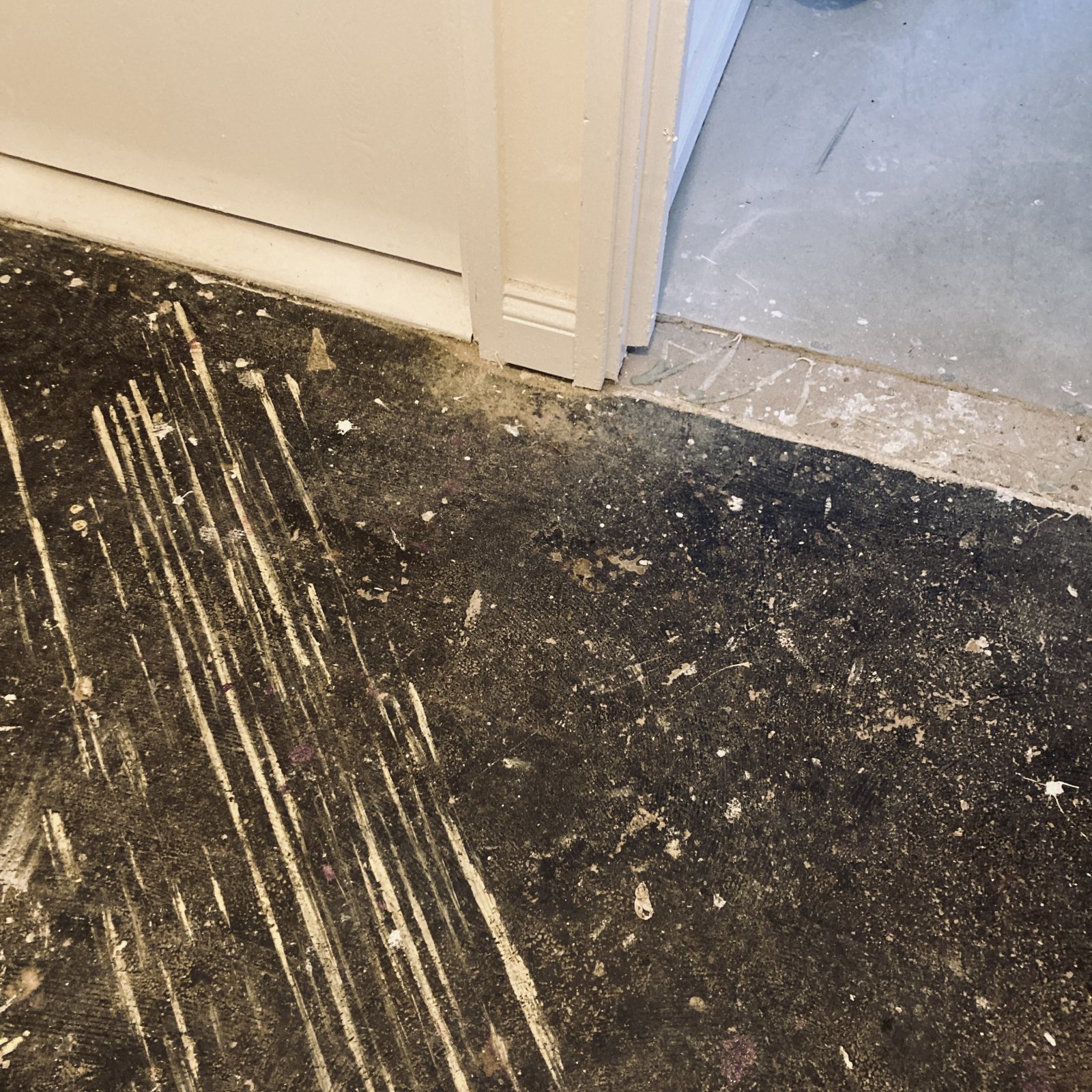 New flat is top floor of a purpose-built block made in the late 70's/early 80's. The floors look to be some kind of black stuff that is slightly rough to the touch. No idea what it is, asbestos? Perhaps that's like a layer or screed over boards or concrete panels. The grey area through the door is the lounge which appears to have a further thin cement screed so I'm guessing the previous occupants had laminate in there which has since been removed.The flats are brick/block and are five stories high.