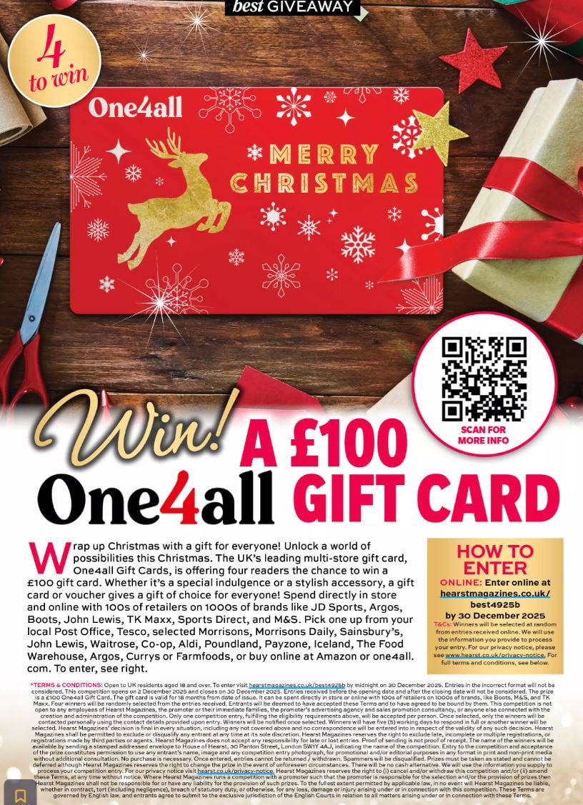 The prize is a £100 One4all Gift Card. The gift card is valid for 18 months from date of issue. It can be spent directly in store or online with 100s of retailers on 1000s of brands, like Boots, M&S, and TK Maxx. Four winners will be randomly selected from the entries received.