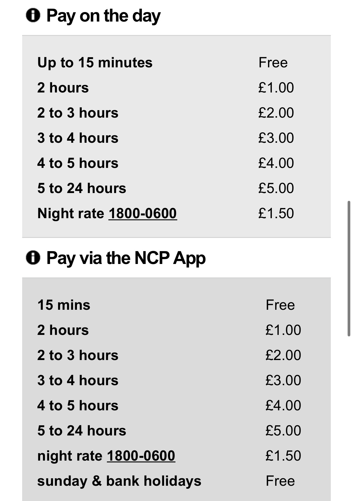 I don’t have any photos of the signage in the car park since I haven’t been back. And I didn’t take any while there when it wasn’t offering the right rate because it was during Storm Claudia and the rain was horizontal.I will put in a complaint to NCP.1
