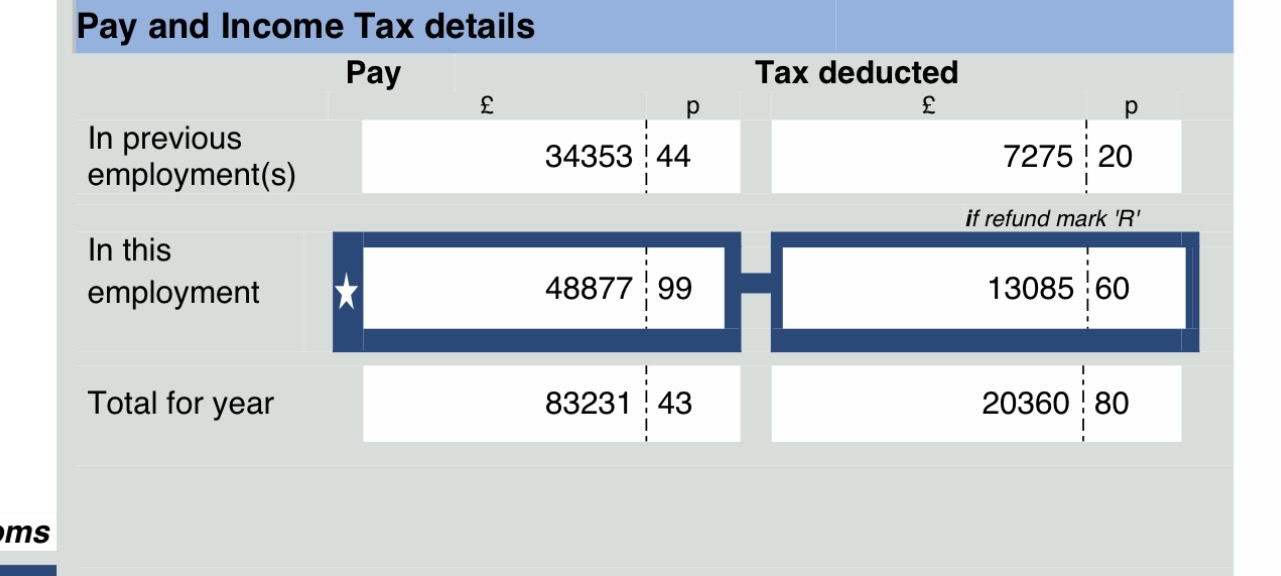 Once again, thank you for persevering with this and continuing to help me! Below is the relevant info from the P60 - you can see the discrepancy with the P800 is the pay and tax from the first job. The P60 figures exactly match my P45 from the September and my final payslip from that employment …