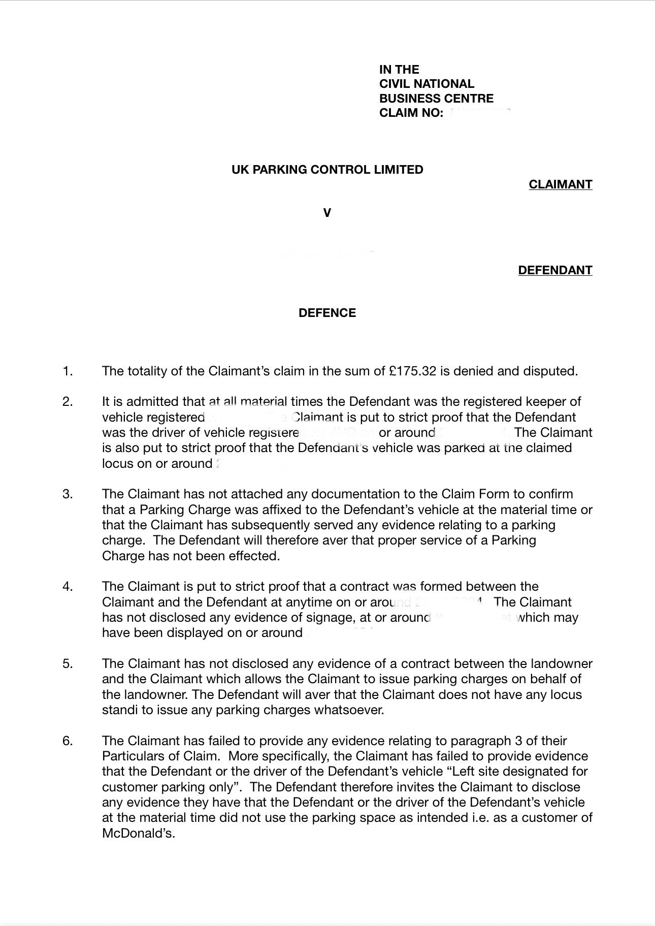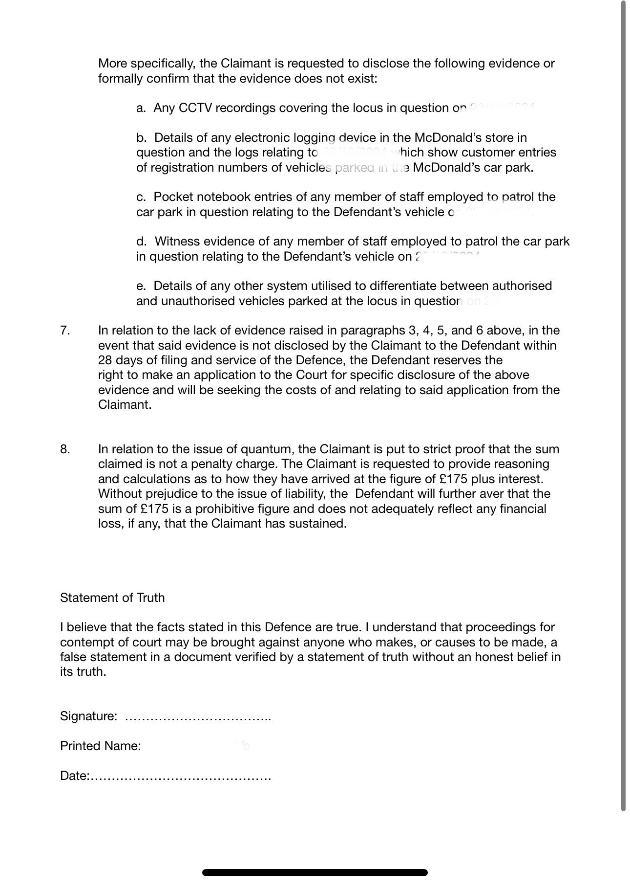 As was made clear in my Defence, the crux of their case was that the driver of my vehicle at the time was not a visitor to McDonalds however they did not disclose any evidence to back up this assertion. All they had was photographs of my vacant vehicle. There was no CCTV, photo evidence, witness evidence from an enforcement officer or logs from computer systems logging the users of the car park.0 -