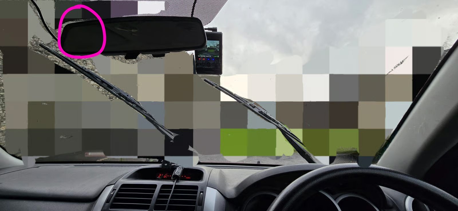 My Dashcam is fitted to the left of the rear view mirror at the same level. If you can see what the camera is recording then it is illegalIn the picture the camera is illegal - needs to be other side of mirror0