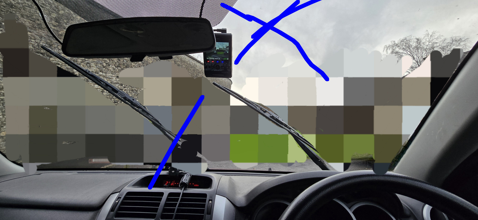 You must not have cables in your field of view, particulaly directly in front of you. Can't tell from your photo if the black line(s) is/are cable or your wiper blades stuck halfway or what the blue lines are meant to represent. We have a dashcam ( it was fitted before we bought the car ) and all cables are tucked behind trim.0