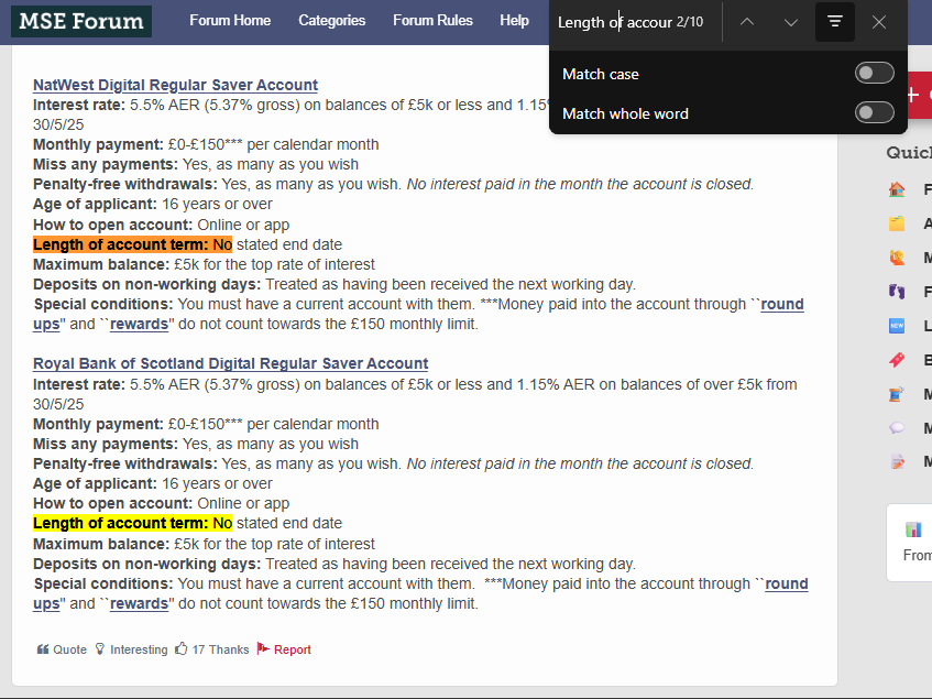 + in addition to the Edge Saver there's Cahoot Sunny Day Saver £3K@5% (can have more than one account) and Skipton Member Bonus Saver £5K@4.75%....if it's still available. None of them are regular savers.denow said:I have a Natwest regular saver which I've spent over 3 years building to the £5000 limit. I take the interest monthly to keep it at the £5000 and getting the 5.5% on that. I'm halfway through the same with the RBS equivalent.