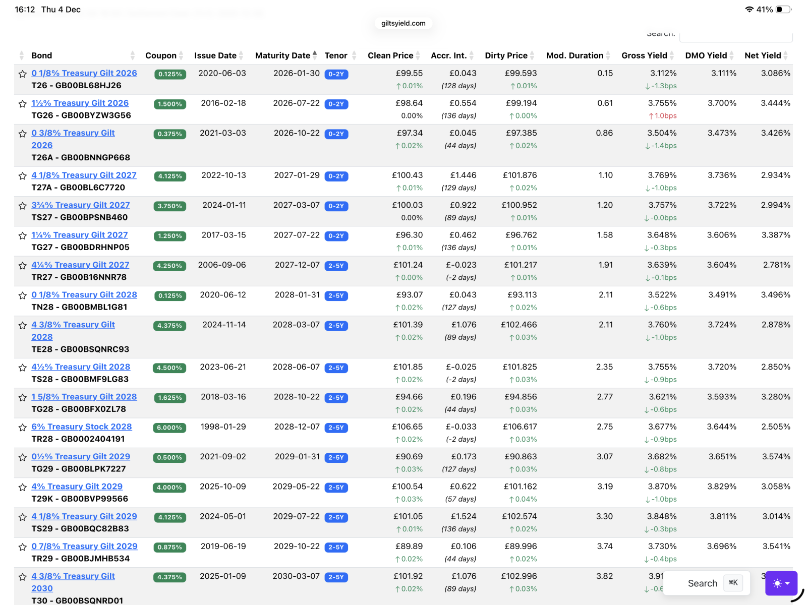 In the table below look for e.g., TG26A, TN28, TG29 and TR29. If you search the investments board you'll find some threads on gilts.
