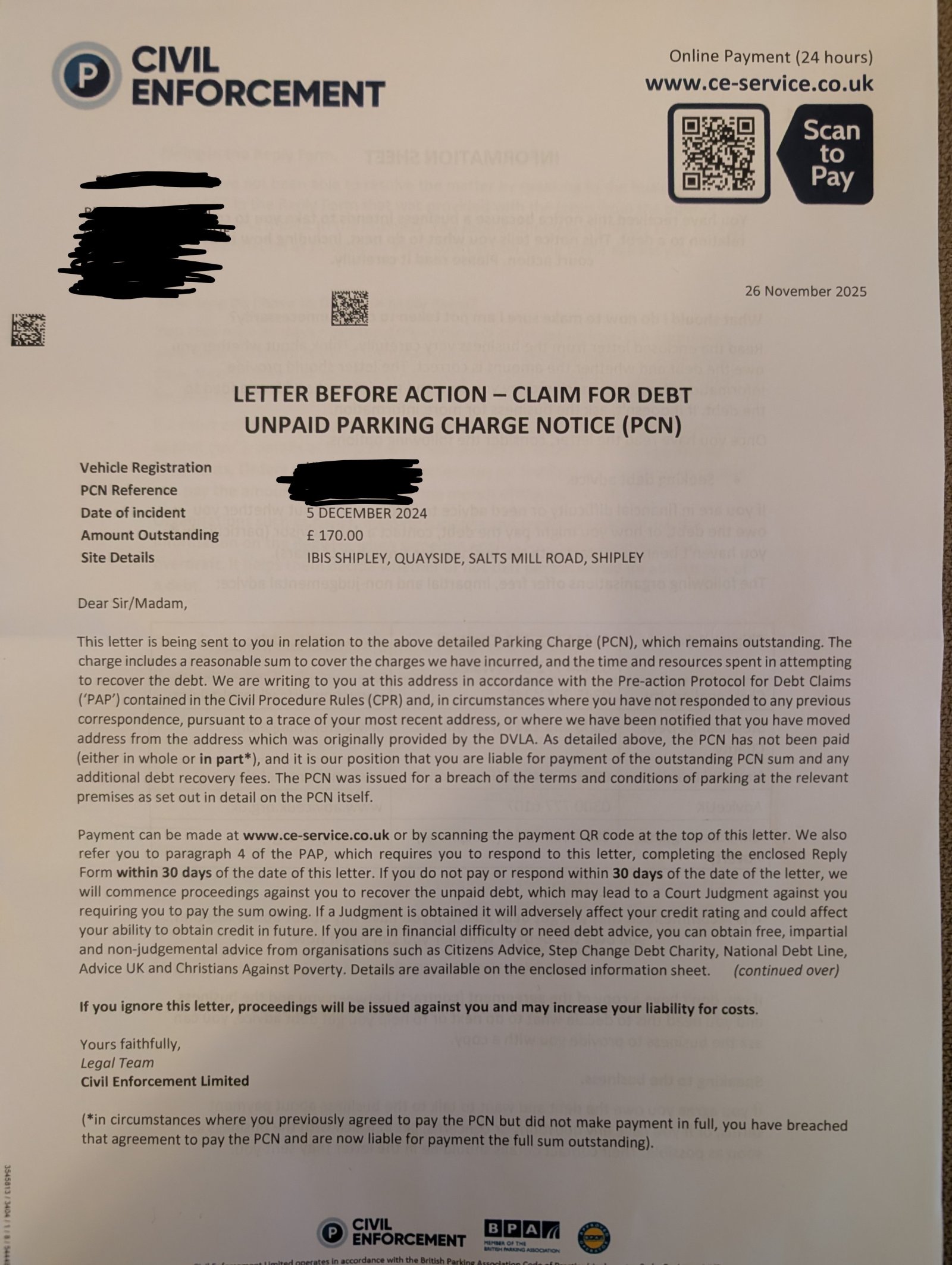 Today 4/12/2025 I received the following letter from Civil Enforcement LTD with the well documented £170 request, but could anyone please help me with the following points of note.