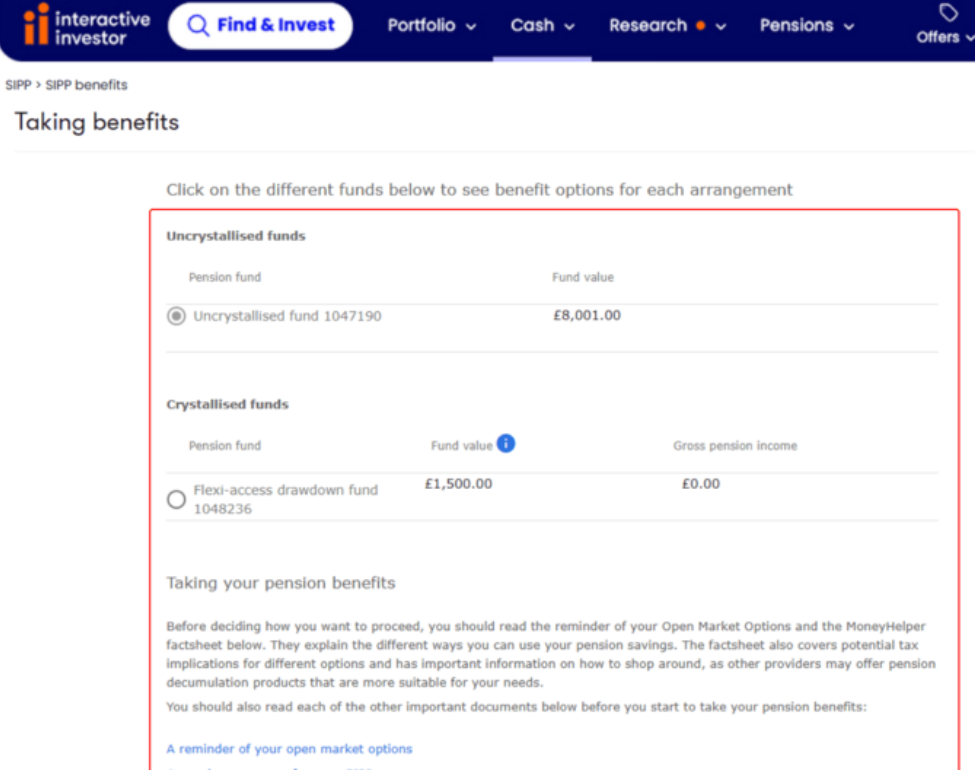 Can you perhaps clarify this? I have not yet taken anything from my ii pension, but the worked example on the web clearly shows two separate pots for crystallised and uncrystallised. (These are not my figures, just those in the on-line help),michaels said:II don't let you seperate crystalised and uncrystallised funds. Myself and another person I know have had real issues with the amount of time ii transfers take and that you can't drawdown whilst waiting for them to be finalised.
