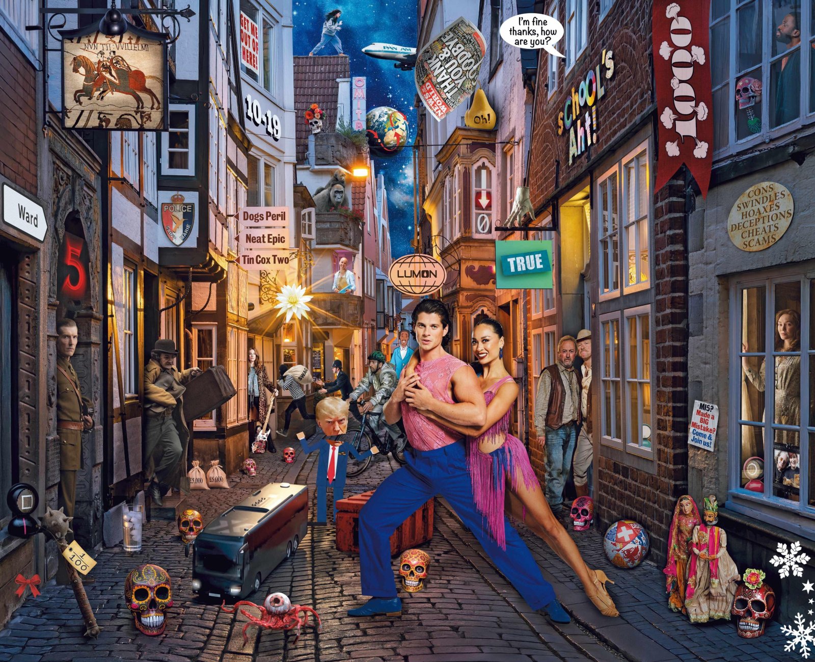 What are the two figurines in the bottom of the right hand picture? Who is the man in the window top right hand side? Who is the soldier in the left hand doorway?