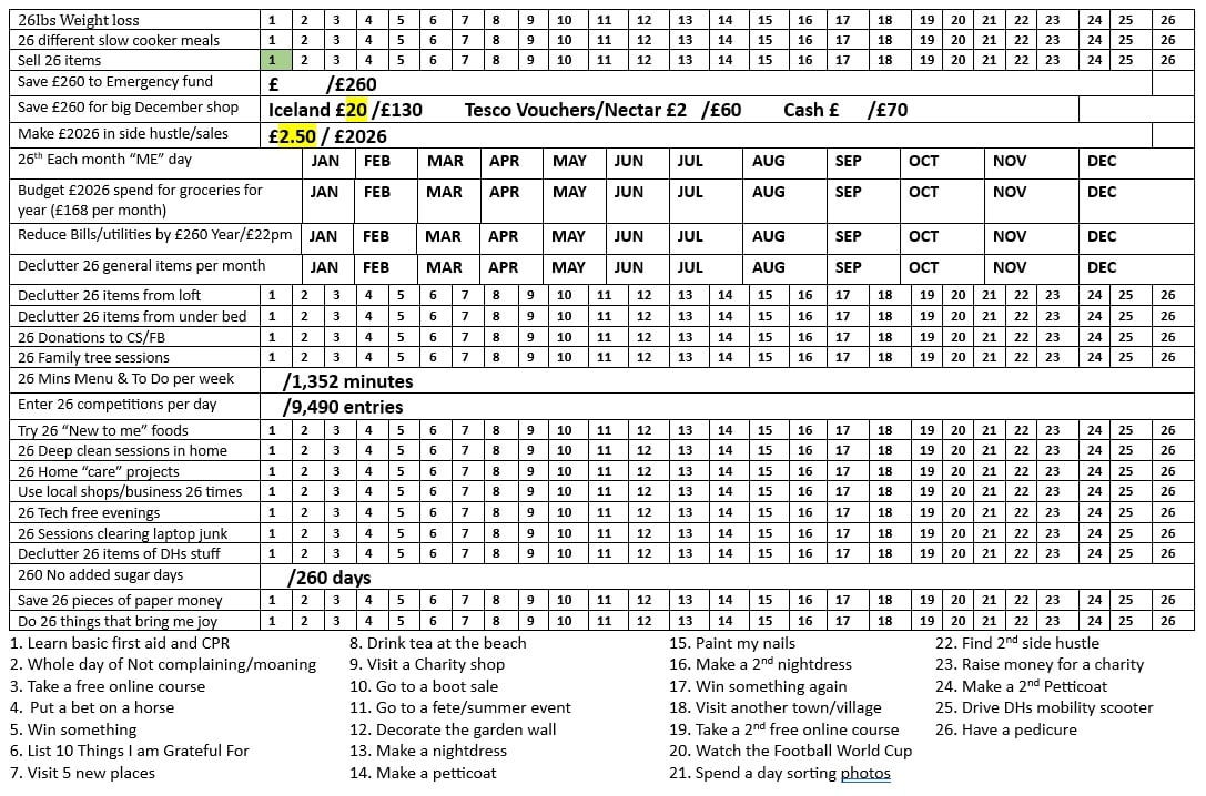 1. 26 Random Acts of Kindness2. Complete 26 craft projects from stash3. 26 days out with DH, DD or friends4. Complete 26 Parkruns5. 26 charity shop rummages/car boot sales6. Deep clean/refurb 26 areas in the home7. Recycle/repurpose/donate 26 items of clothing8. 26 intensive selfcare/spa sessions9. 26 baking/batch cooking sessions10. Read 26 library books11. Make 26 jars of hm jams/chutney/syrups12. Grow 26 plants (flowers, fruit, herbs & veggie)13. Cook 26 special "date night" meals or picnics with DH over the year14. 26 charity cash donations15. Save £202616. Try 26 new recipes17. 26 home repairs18. Host 26 friends/family for meals19. 26 no spend days per month20. Eat clean & log food 26 days per month (to reduce cholesterol & weight!)21. Listen to 26 inspirational podcasts (rather than Royal gossip dross)22. Journal 26 days per month23. 26 alcohol free days per month24. Reduce grocery bill by £26 per month25. Run 26 miles per month26. Declutter 26 items per month3 -