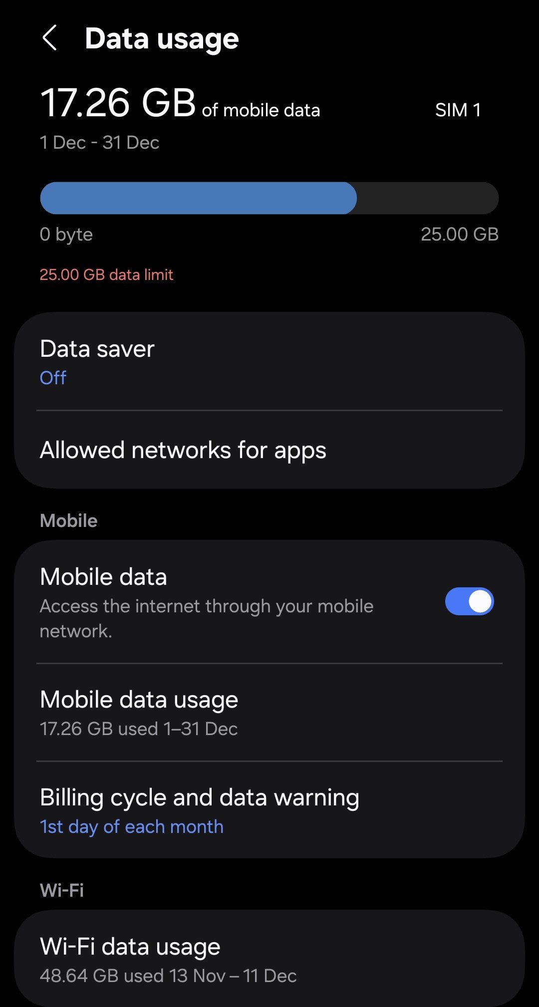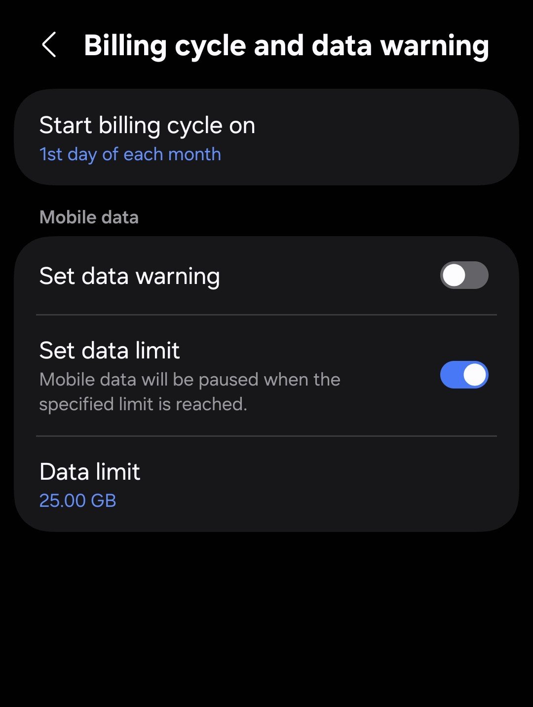 You are right, switch off the 'set data limit' toggle in photo 1 as currently your phone will switch off mobile data at 25GB and it won't switch mobile data back on until the 1st of the month (billing cycle date).