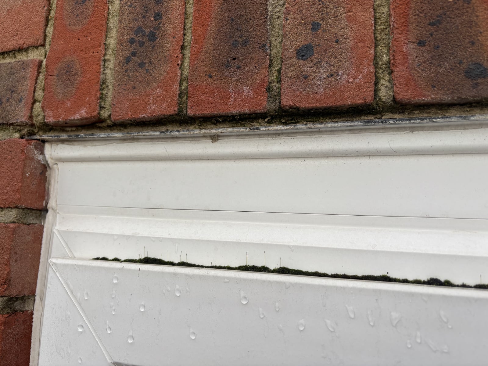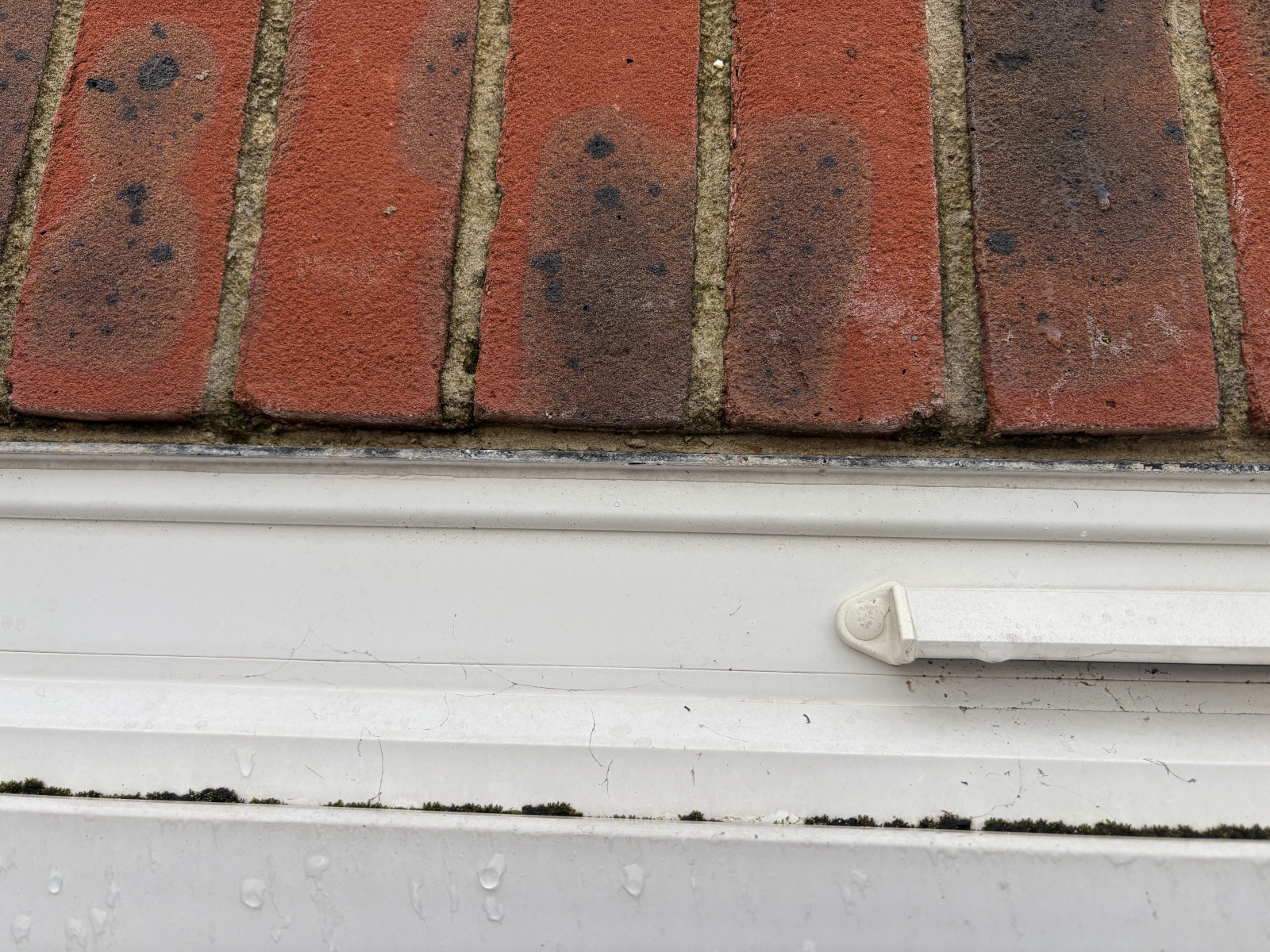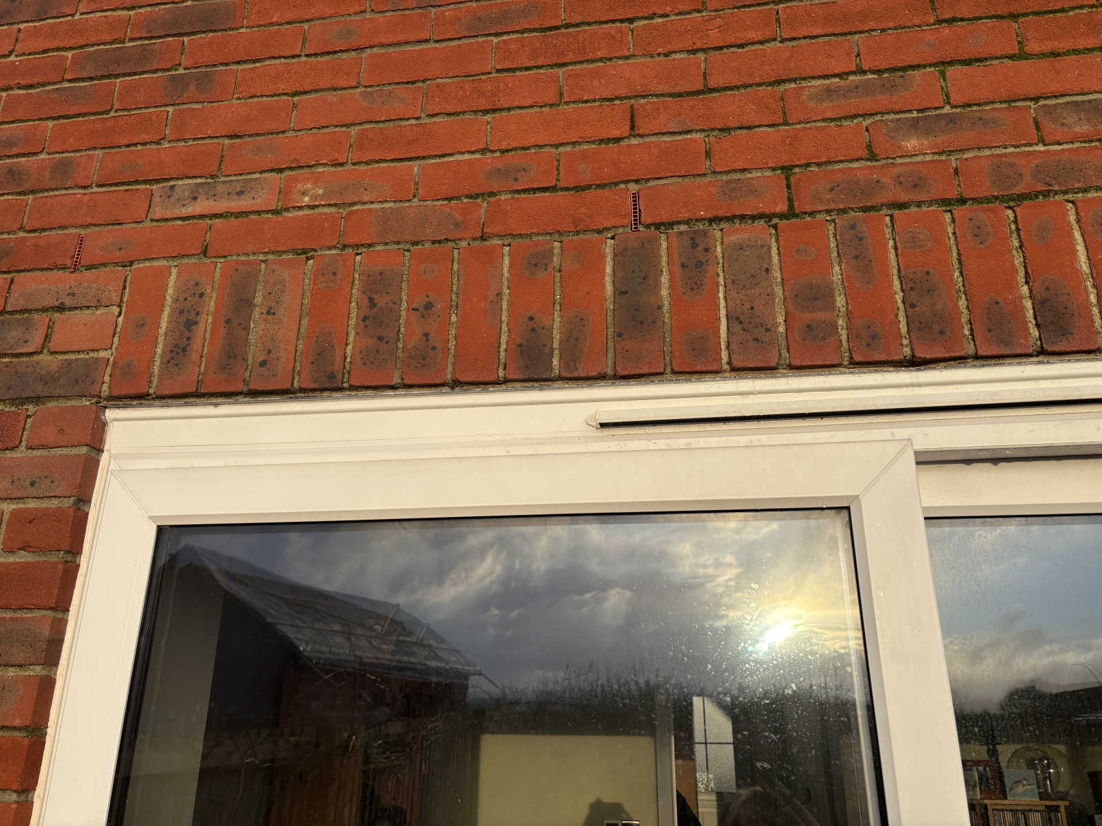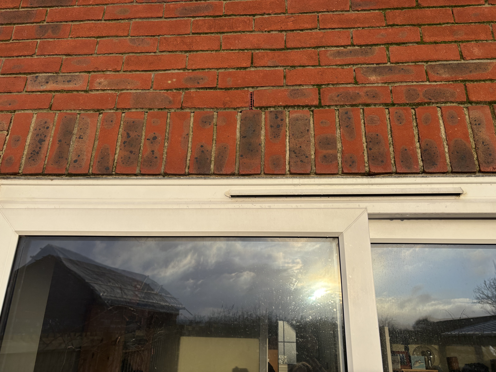 Based on the moss in the mortar above it and the marks to the right of the trickle vents I think the guttering or downpipe is blocked causing water to pour down the wall2