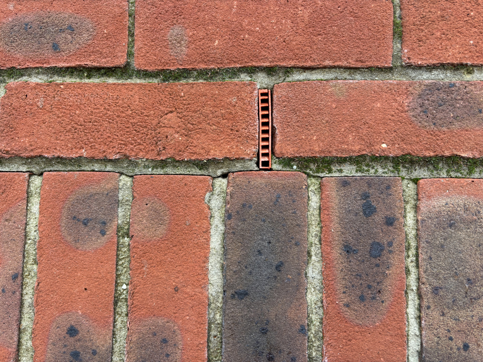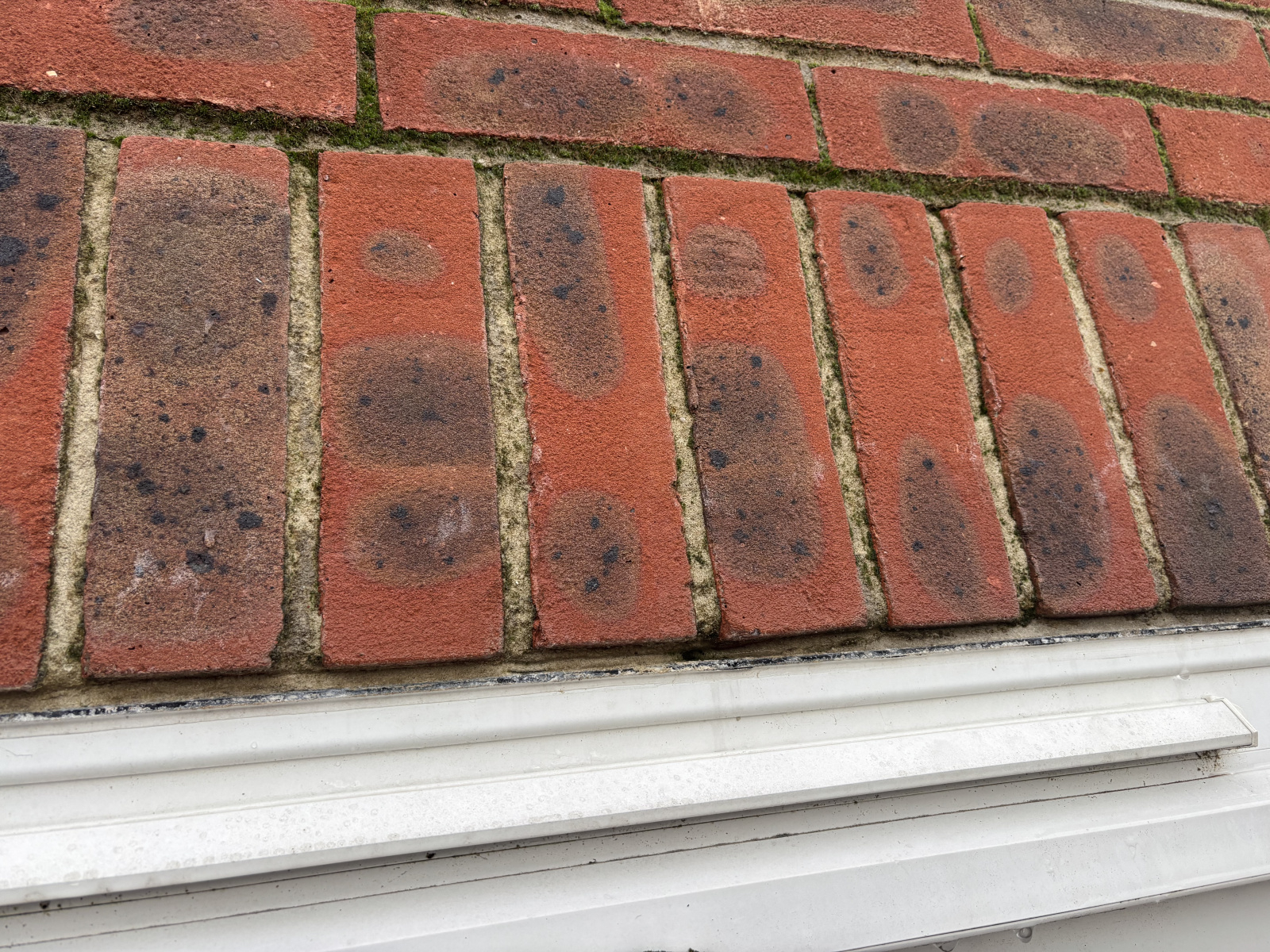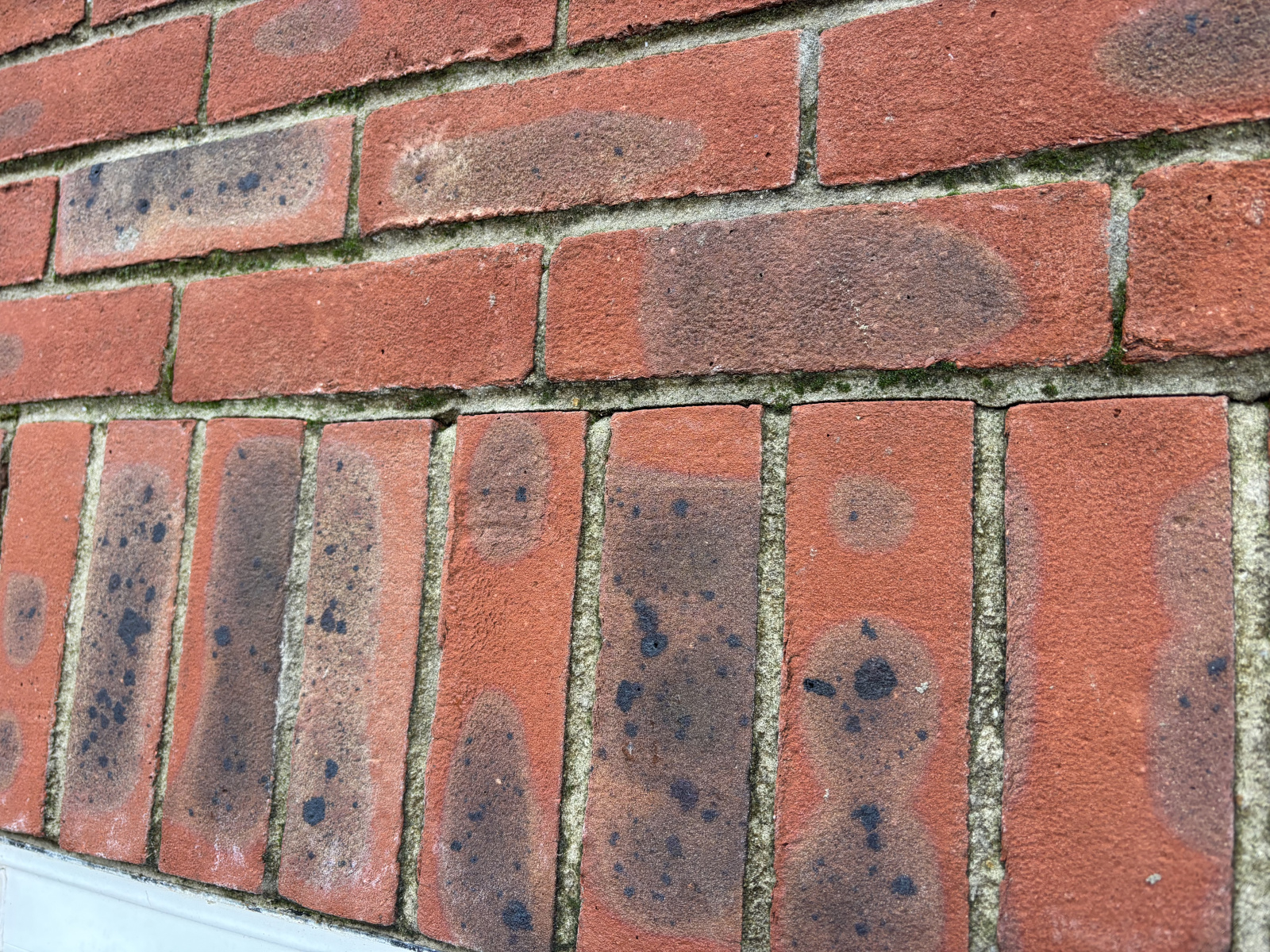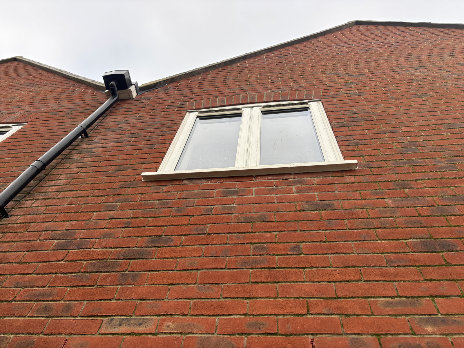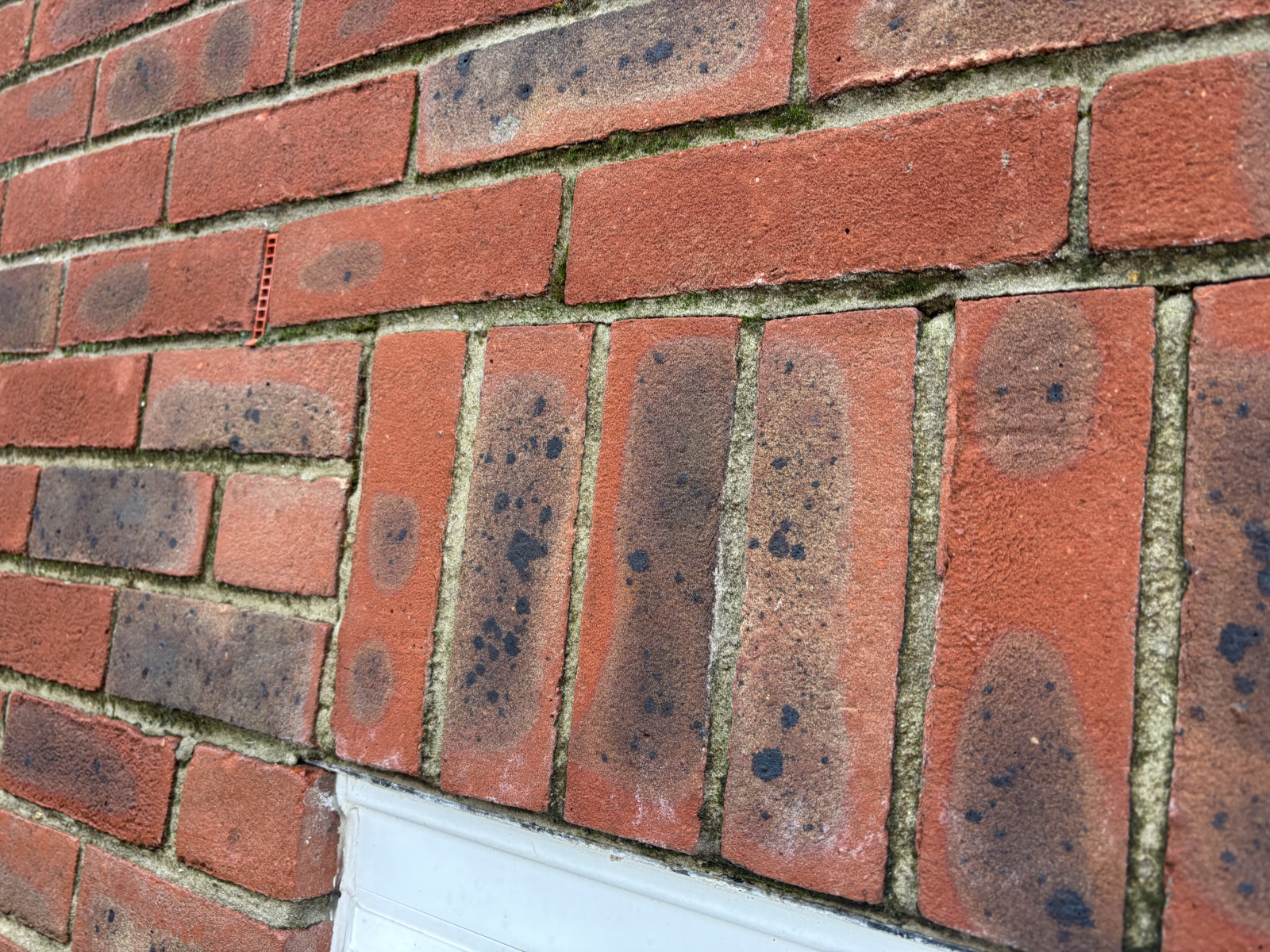 Based on the moss in the mortar above it and the marks to the right of the trickle vents I think the guttering or downpipe is blocked causing water to pour down the wall2
