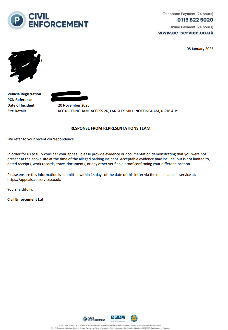 I received a response from CE today. I have uploaded a copy below. I'm not sure I should have to prove my vehicle wasn't there, but as always I shall await the wisdom of those more knowledgeable. Thanks for all the help so far.