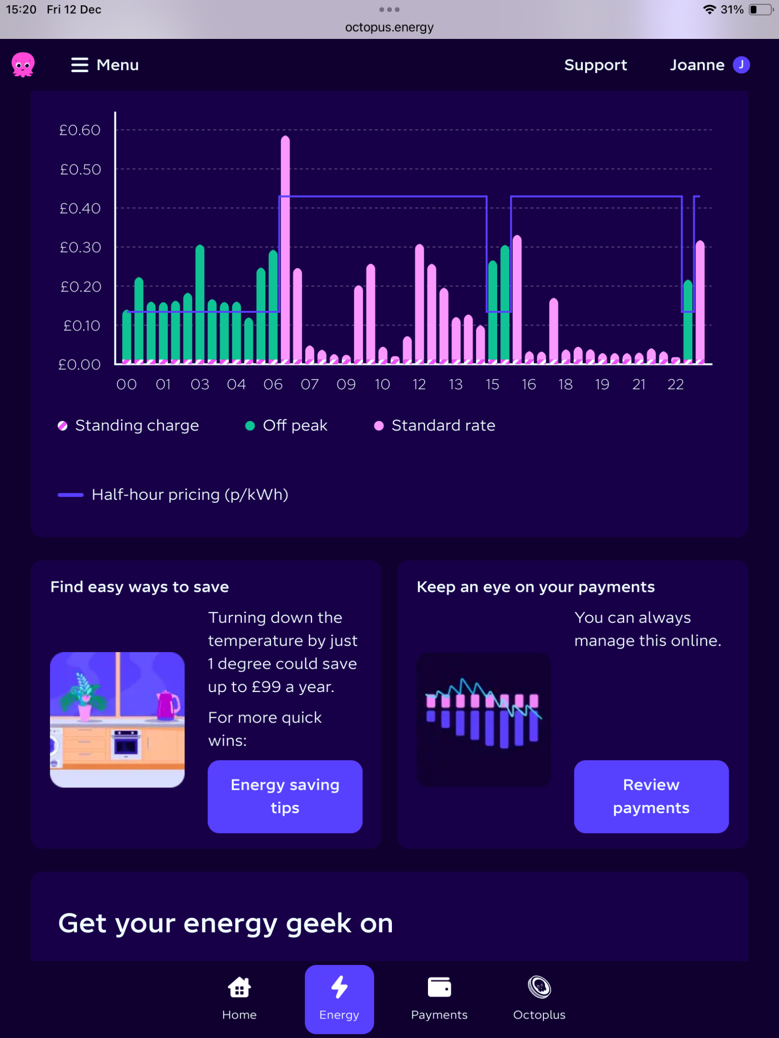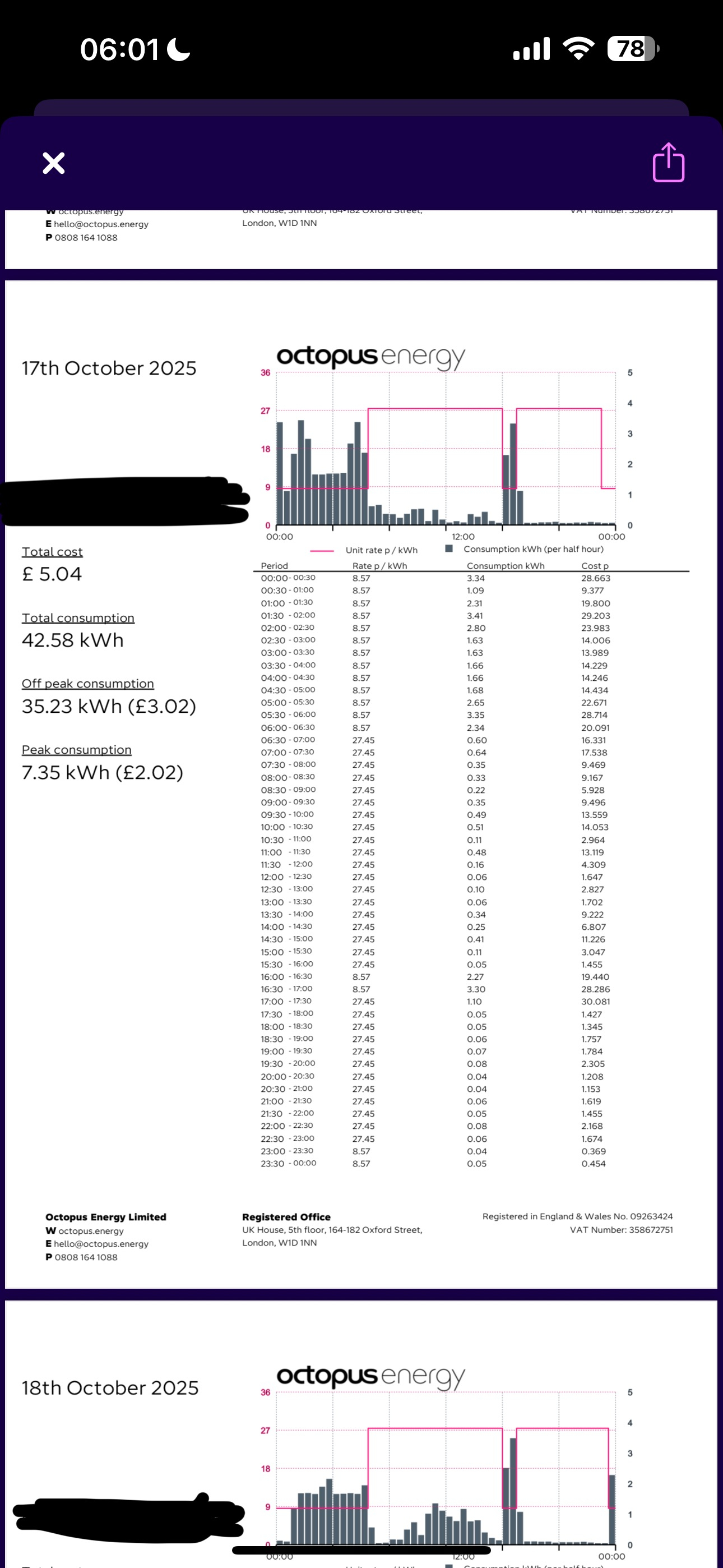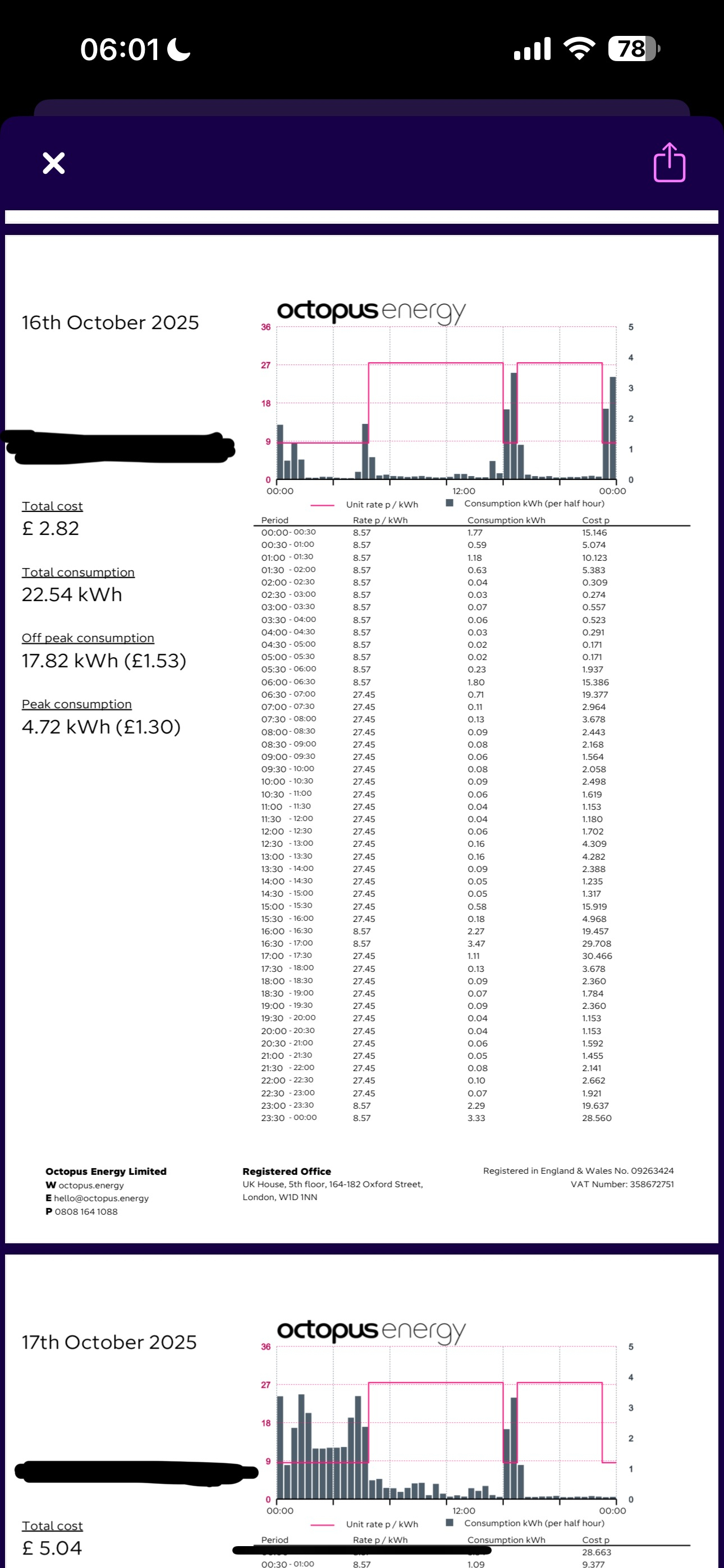 You should have had at least one bill since the 20th of October. Have you checked it?Jackie62 said:It's been going on since 20th October. No doubt the next bill will be sky high because of this clock error and I expect full reimbursement.Your off-peak times have changed, but are you being charged at off-peak rates during those periods? Or have you been charged at peak rates?N. Hampshire, he/him. Octopus Intelligent Go elec & Tracker gas / Vodafone BB / iD mobile. Ripple Kirk Hill Coop member.Ofgem cap table, Ofgem cap explainer. Economy 7 cap explainer. Gas vs E7 vs peak elec heating costs, Best kettle!