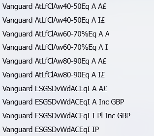That's just an example, my point was that it's harder to find certain funds as there is no specific naming convention. In HL they all have a full name whereas in Barclays some are called Return, some Ret, Rtn, RT.. sometimes spaces are missing etc.Albermarle said: