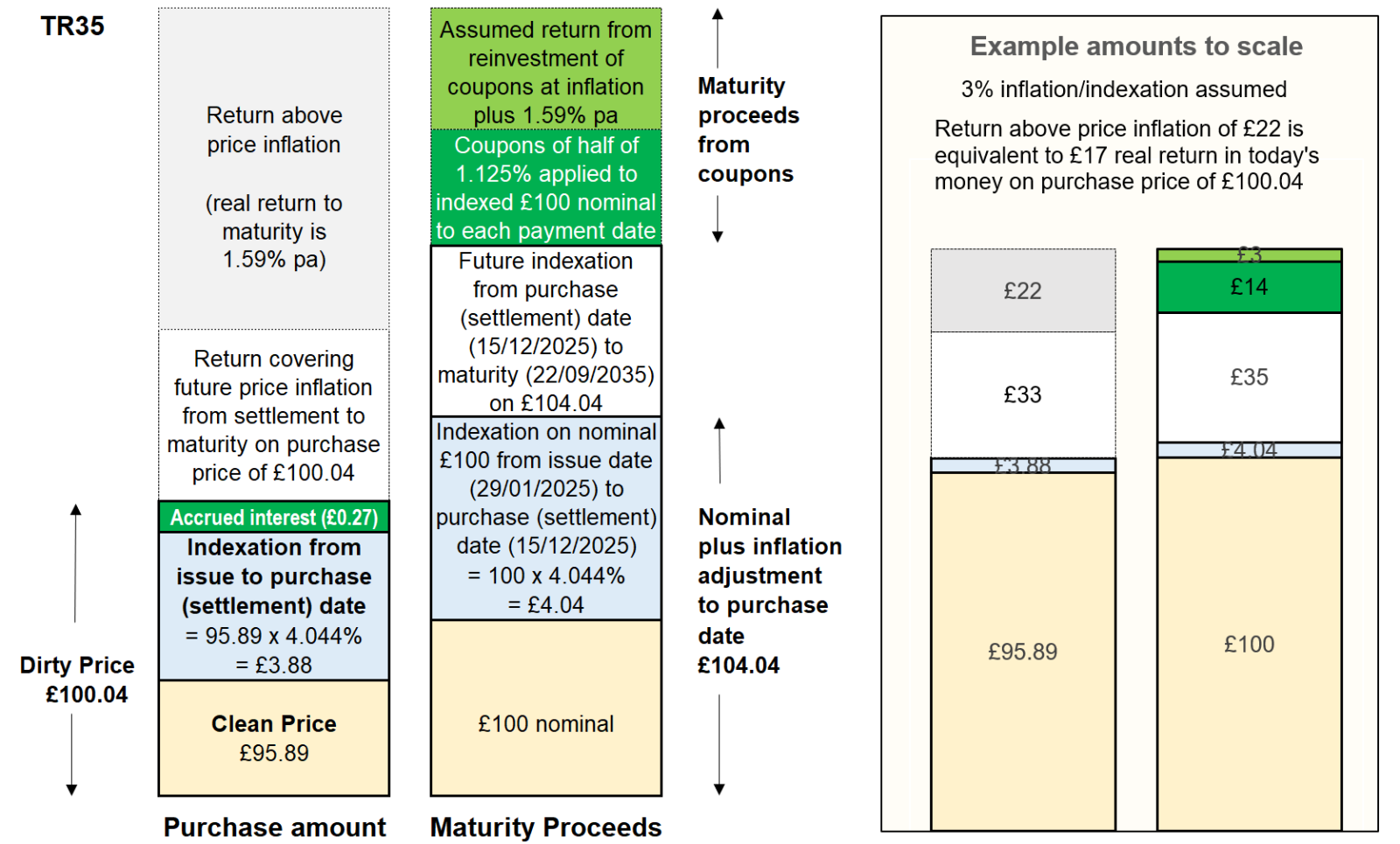 The overall real return was 1.59%pa (the real return to maturity assumes compounding) based on Friday's closing price. It's about 1.55%pa real yield based on today's closing price. And obviously it will depend on the price when you actually buy it. That real return is above RPI inflation to 2030 and then CPIH inflation from 2030.The real return is more than 1.125%pa because this index linked gilt is priced below par (i.e. the clean price was 95.89 at Friday's close which is less than 100). If the clean price was 100 then the real return would be 1.125% but bar a huge market movement it will be less than 100. This assumes it is held in a tax free wrapper such as an ISA or SIPP and so your real return is the same as the gross real return.The diagram below shows a breakdown of the real yield based on Friday's close. The real return (the top bar on the left) comes from (as shown on the right) the coupons and the maturity amount being more than the purchase price plus indexation.