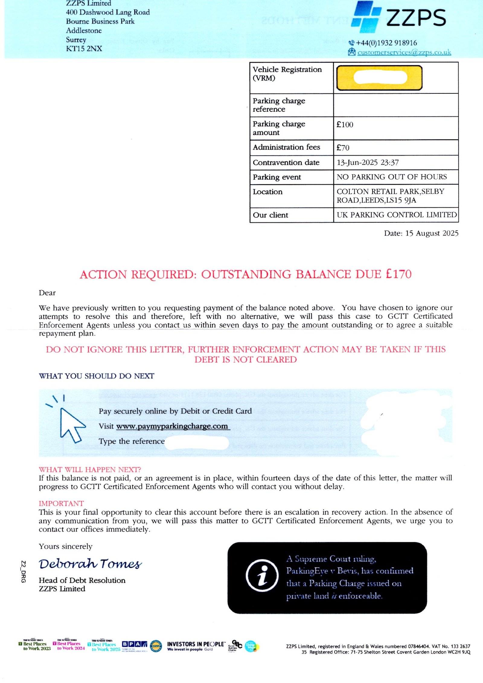 What a complete load of rubbish with the UKPC letter. The charge is £100 not £170 ? UKPC ARE LYING TO YOU AND IF IT GOES TO COURT, a letter to show a judge.